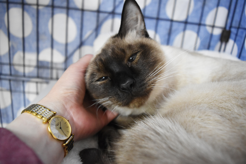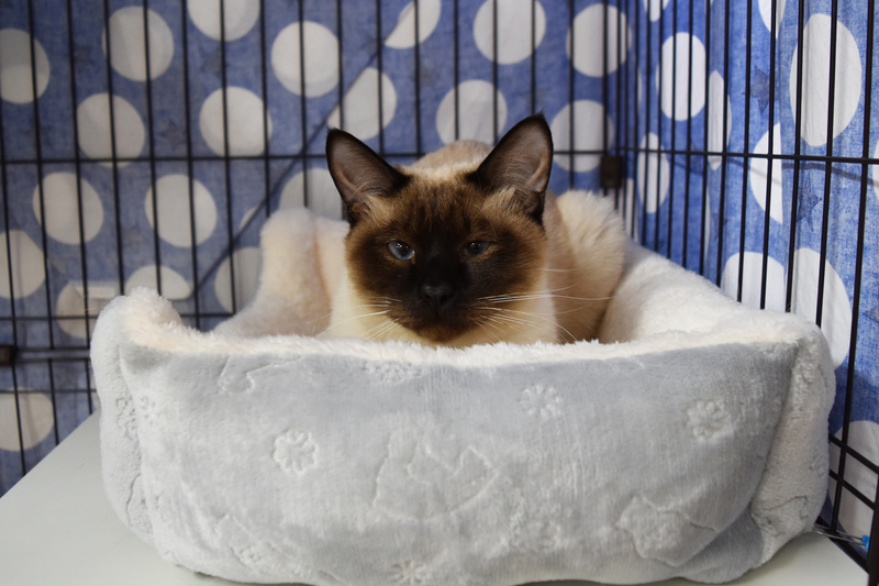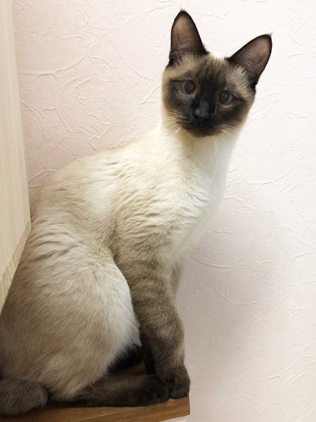 | 特徴(性格など) | ウィルス検査:猫エイズ・白血病ともに陰性 3種ワクチン済 ブロードラインで駆虫済みです。 体重:4.26kg 尻尾は短めで先がカギしっぽです。 シャム風の柄です。ブルーアイです。 基本甘ったれで、撫でると頭を擦り付けてきたり、転がってお腹を見せたりします。ケージ慣れしているのか昼も夜も大人しいです。ちょいとビビりで何かの拍子にパニックになることがあります。 お座布団の下に隠れてしまうシャイな所もあるようです。 |