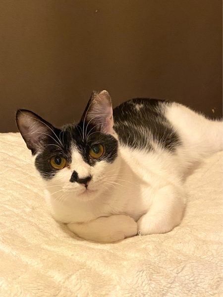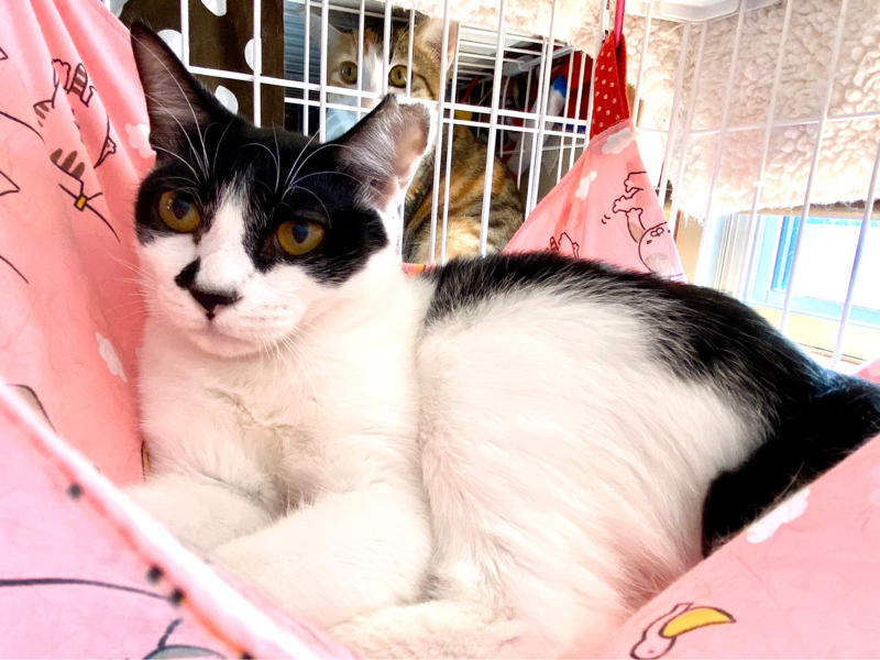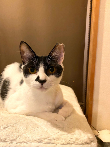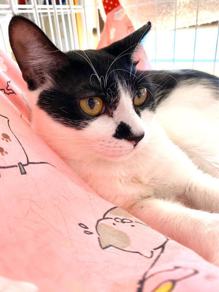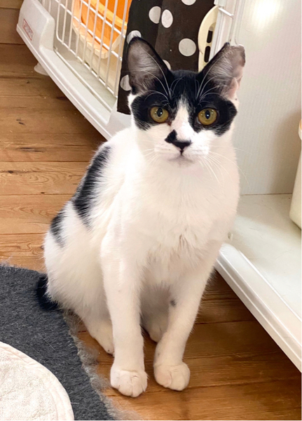 | 特徴(性格など) | ヤッホー! ボクちんは、おはぎくんだよ おもちゃ大好きで、いつまでもおもちゃで遊んでるよ! あと、ボクちんはハンモックが大好きで、ハンモックがあればとりあえずそこで寝ちゃうんだよっ! 好きな猫さんのタイプは、年上のお姉さん猫かにゃ? ボクちん、オス猫より年上のメス猫さんが好きにゃんだ ちょっとビビリでヘタレんちょでもあるけど、こんなボクちんをよろちくお願いしまーす。 -------------------------------------------------------------------------------------- お鼻のちょび髭といい個性的な柄が特徴的な黒白猫オスくんのご紹介です。 仮名はおはぎくんと言います。 おはぎくんを保護した時の様子などはYouTubeのちゅー猫チャンネルをご覧いただければ幸いです。飢えてガリガリで、便からはビニール袋が出てきました。それほど飢えていたのでした。 https://youtu.be/31m2rmtUyhU 保護してからのその後の様子などもYouTubeをご参照ください。 まだ生後約10ヶ月ぐらいなので、まだまだ遊びたい盛りです。 オモチャが大好きで、オモチャを与えてあげると喜んで遊んでいます。 遊び終わると大好きなハンモックで寝るのがおはぎくんの至福のひとときらしいです。 人懐っこくて、抱っこもさせてくれるので迎えてくださるご家族はかわいくて堪らないと思います。 他の猫との関係性も特に問題はないのですが、年上のメス猫さんがタイプのようです。 飢えてガリガリになりながらも生き抜いてきた子猫でした。 これからの猫生は幸せしかないと願って、ぜひ、この子のご家族になってくれませんか? かわいい子ですので、よろしくお願いします。 おはぎくん、譲渡会でお待ちしてまーす! |