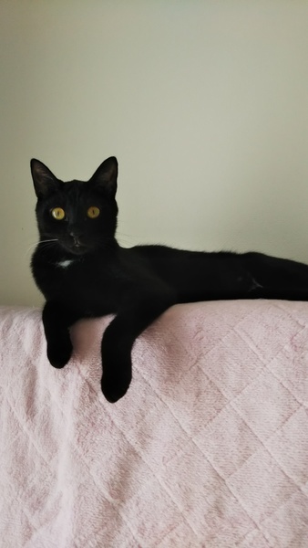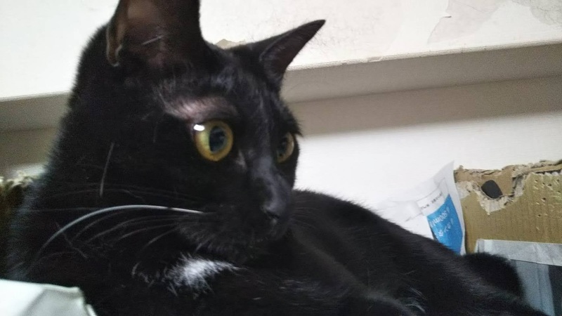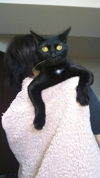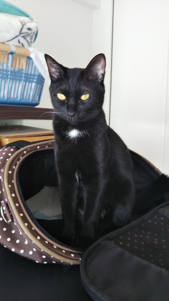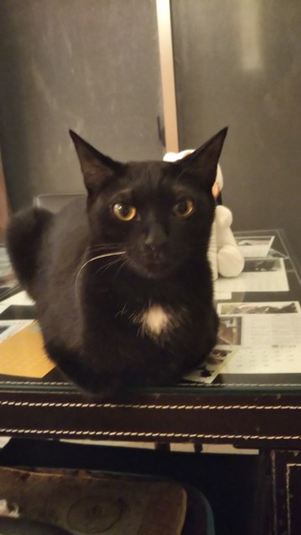 | 特徴(性格など) | 黒猫で胸に白いチャームポイントがあります。 とにかく寂しがりやの甘えん坊で一日中人について回り、背中や膝に乗るのが大好きな子です。 お兄ちゃん猫と共に育ち、拙宅には複数猫が居ますので、猫にも物怖じしません。 |