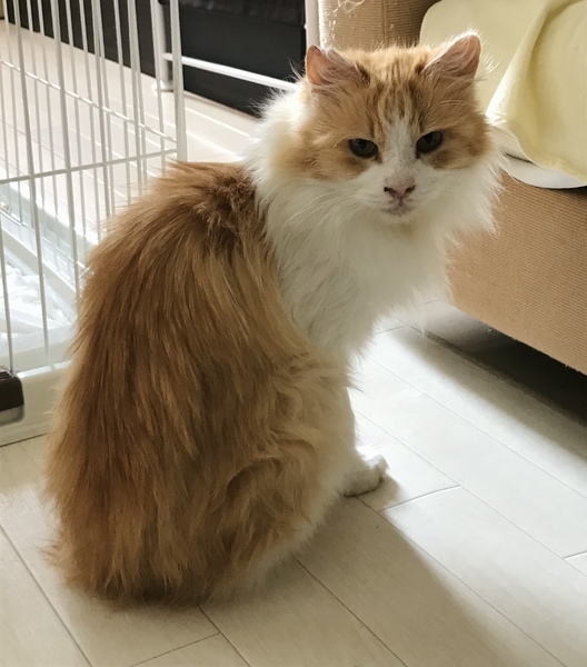 | 特徴(性格など) | 茶白の長毛です。オモチャで遊ぶのが大好きです。少し怖がりですので少しずつ距離を縮めて頂けたらと思います。とことこ歩くところに着いてきたり、少し離れてずっと観察してきたりして、とっても可愛いです。 猫とも犬とも仲良く出来ますし、とっても優しい子です。 エイズキャリアではありますが、ストレスなく穏やかに暮らせれば、発症せずに長生きする事も珍しくありません。 |