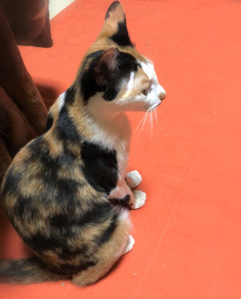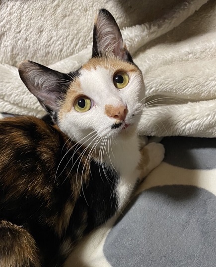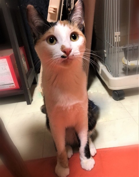 | 特徴(性格など) | 仮名、スキッピー くっきり三毛柄・女の子・鼻下にㇵの字ひげ 環境に慣れるまで時間が必要です。 好奇心旺盛で運動能力の高い子です。 抱っこは苦手ですが、眠る時は必ず人の横でゴロゴロ言いながら丸くなります。 何かするでも無く、気付くとぴったりくっついて座っていたりします。 |