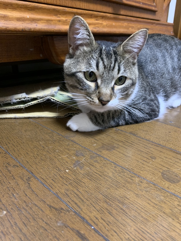 | 里親募集する理由 | 2019年10月、雨が降って土砂降りの中、足を怪我していたところ、保護しました。 今では、もう1匹の先輩保護猫と追いかけっこしたり、エサを奪い取ったりと元気に遊んでいます。 今回、自分や子どもに猫アレルギーが発症してしまい、里親を募集することにしました。 |
