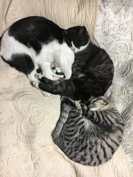 | 特徴(性格など) | ①クロちゃん(メス)(恐らくお姉ちゃん):避妊手術済 比較的落ち着いていて、弟2匹に慕われている優しいお姉ちゃんです。2匹が寄ってくるとペロペロと舐めてあげています。 ②コロン(オス):去勢手術済 人懐っこく、すぐにひっくり返りコロンとお腹を見せるお調子者です。 シマがお姉ちゃんにくっついていることが多いので、1匹マイペースで日向ぼっこしていることもあります。この子は1匹でも大丈夫と思います。 ③シマ(オス):去勢手術未 少し人見知りで、おとなしい感じです(でも時々密かにいたずらもしています)。 他の2匹より食が細く、食べるのも遅く、小柄です。 病院でオスだと言われるまで、メスだと思っていました。 クロお姉ちゃんが大好きでいつもくっついています。 できれば、この子はクロお姉ちゃんと一緒に引き取っていただけると幸いです。 平日は猫たちだけでのお留守番で、私と家族(1名)以外の人に会ったことがなかったので、先日近所の動物好きな方に会ってもらったのですが、3匹とも警戒して距離を取ってその方を見ていました。 でもずっと一緒に居ると慣れると思います。 |
