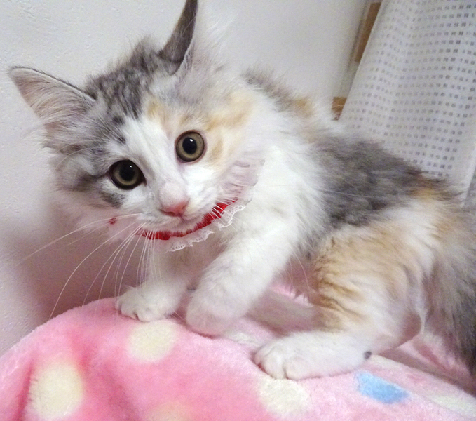 | 特徴(性格など) | 【猫の仮名】 萌(もえ)ちゃん (担当 松嶋) 【毛色・柄】 長毛のパステル三毛、長くて真っ直ぐなフワフワのシッポ 目にアイラインが入ってパッチリ♪ 少女アニメの優しい顔をしていますが元気でお転婆な女の子です♪ 家猫の母猫の元で育ったので栄養状態が良く、きれいな子です♪ 猫を飼うのが初めての方でも大丈夫です♪ 長毛なので毛玉ができないように抜け毛取りブラシをして下さい。 走っても大丈夫なペット可のお住まいで、猫だけのお留守番が長時間でないご家族を募集しています。 元飼い主の希望により、お一人暮らし、同棲中の方、ご高齢の方には譲渡できません。 このネコちゃんは、4/18(日曜)の ゆめネコ譲渡会 に参加予定です♪ ☆面会をご希望の場合は、こちらの「お問合わせ」からお願いします。 http://yume-neko.net/contact.html |