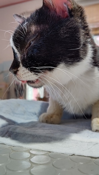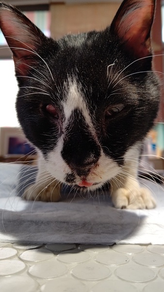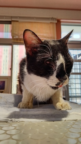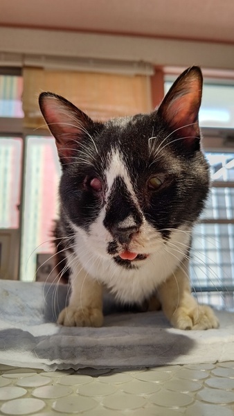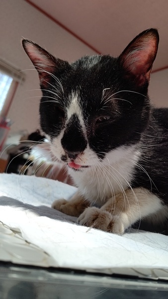 | 特徴(性格など) | 先天性の事で、 右目が収縮して無いようにみえます 。 エイズ陽性ですが、現在発症無く元気です! 前歯が無く、犬の様に舌を出していて可愛らしい! 歯が悪いですが、ドライフードが大好きです。 現在口内炎も落ち着いています。 |