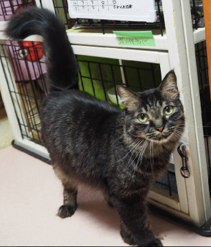 | 特徴(性格など) | 顔はキジトラ風ですが、背中は黒くツヤツヤしている中毛ふわふわの猫です。 穏やかな性格で他の猫とも仲良しです。 人も好きなので足元にスリスリしてくれたり、撫でられるのも好きです。 ちゅーる大好きで食べる時の顔がかわいいです。 |