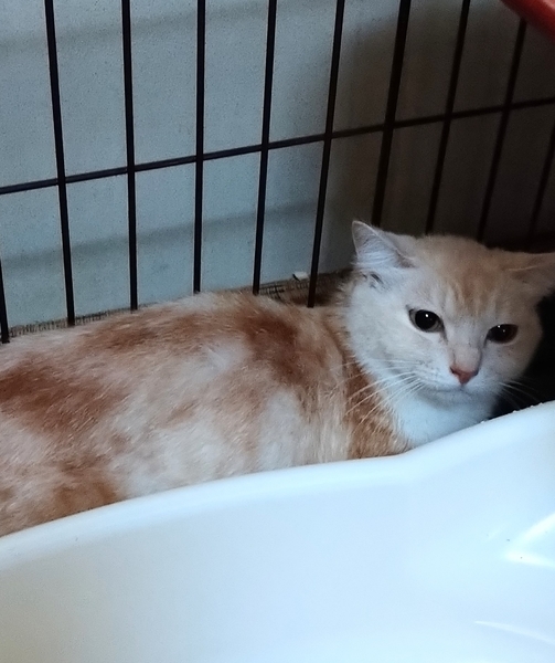 | 特徴(性格など) | ミルクティーのような綺麗な クリームベージュの色の猫ちゃんです。 とても怖がりです。この子は生粋の野良ちゃんだと思います。 まったく人になれていません。 というよりも、人間が怖くて、隙間に入り込み姿をみせない状況です。 しかし、シャーなどの威嚇はありません。 もしかしたら、威嚇をすることもできないほど人が怖くてかたまっているのかもしれません。。。 |