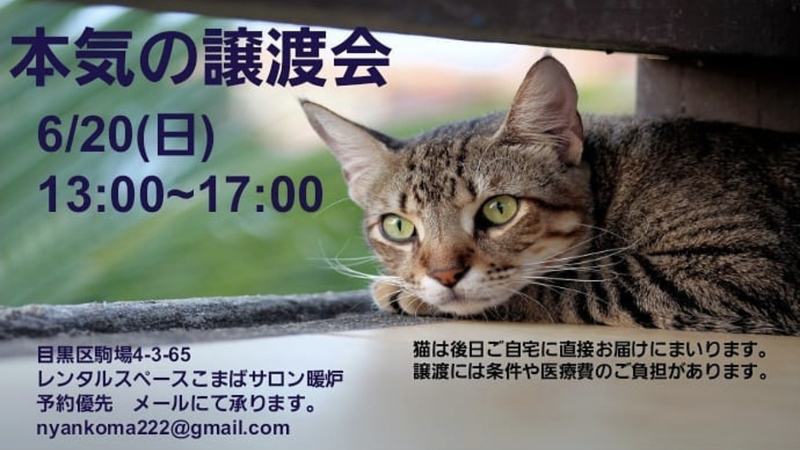 | その他(譲渡条件など) | ペットとしてではなく、生涯家族として猫を迎えて下さる方への譲渡となります。 原則ねこけん譲渡会等でのお見合いにてお申込みをお願いしております。 ◆猫さんたちとのお見合について◆ 原則「ねこけん譲渡会」でのお見合いをお願いしております。 現在ねこけん譲渡会「虎ノ門会場」および「練馬会場」での定期開催は自粛しております。 2020年11月より「島忠ホームズ」にてねこちゃん譲渡会を定期開催しています。 ※保護猫の中には性格や体質で譲渡会への参加が難しい猫さんもいます。 気になる猫さんの譲渡会参加予定の確認等も、下記連絡先へお問い合わせください。 ※譲渡会へご来場いただくのが困難な方は、個別お見合いが可能な場合がございます。 個別お見合いご希望の方は、下記連絡先までご相談ください。 譲渡会には家族を待っている猫さん達がたくさん参加します♪ 募集サイトに掲載のない猫さんも参加することがあります。 家族としてお迎えいただく猫さんです。 譲渡会場で実際に会って、よ~く考えてから決めて下さい! ▼▼ねこけん定期譲渡会▼▼ 毎月第4日曜日 12:00〜16:00 島忠ホームズ仙川店 〒182-0003 東京都調布市若葉町2-1-7 https://www.shimachu.co.jp/gmshop/tokyo/313.html ※当日11:30より整理券を配布。(各回15分、各回先着3組様) 譲渡会等イベント開催日程・詳細は、イベント一覧よりご確認ください。 ▼▼イベント一覧▼▼ https://satoya-boshu.net/event/?@button_name@=search&Event_MemberID=1288 ※事前のご予約などは必要ございませんので、ご家族皆様でぜひお越し下さい。 ※当日の体調などにより譲渡会を欠席することがあります。 当日のお問い合わせにはお答え出来かねますので、ご理解いただけますようお願い申し上げます。 ▽▽こまばサロン暖炉「本気の譲渡会」▽▽ 保護猫譲渡会カフェ こまばサロン暖炉様が主催されている譲渡会に ねこけんの保護猫が参加させていただいていることがあります。 https://www.facebook.com/nyankomaba/events 譲渡会日程や詳細につきましては、主催者様のFBページをご確認ください。 *** ◆必ずお守り頂く事◆ ①終生飼養 ②完全室内飼養 ③年1回のご報告 ④ペット飼育可能な物件にお住まいであること ただし、以下の該当の方は、譲渡出来ない場合がございます。 ※学生、安定的な収入のない方 ※60歳以上の方は、成猫さんを家族に迎え入れることが出来ます。 里親様のご年齢に応じた成猫の譲渡となりますのでご相談ください。 ◆譲渡費用について◆ 不妊去勢手術・医療費の一部負担をお願いしております。 お届けエリアによっては往復高速料金(実費)を別途ご負担いただく場合がございます。 なお、交通費に関しましては正式譲渡に至らない場合であってもご返却できませんので予めご了承下さい。 ・ご希望の猫さんと家族になるまでの流れ ・譲渡時にかかる一部ご負担金などの詳細 ・譲渡契約書のサンプル等 下記URLに掲載しておりますのでご確認ください。 https://nekoken.jp/jotokai/joto-nagare/ https://nekoken.jp/jotokai/joutokibou/ ◆引き渡し方法◆ 必ずご自宅まで猫さんをお届けさせていただきます。 1週間程度のトライアル後、正式譲渡となります。 ◆お届け可能エリアについて◆ 応募可能県内であっても、遠方の場合アフターフォローの関係上お断りさせていただくことがございます。 ご心配な際は、前もって市区町村名や最寄り駅等をメールにてお問い合わせいただけますと幸いです。 お手数をおかけいたしますが、何卒ご了承くださいますようお願いいします。 *** ▼▼連絡先▼▼ ご質問等ございましたらお気軽にお問い合わせください。 NPO法人ねこけん東京本部 https://nekoken.jp/inquiry/ nekoken@cat.email.ne.jp 担当:溝上・志岐 [ホームページ] https://nekoken.jp [Instagram] https://www.instagram.com/nekoken2222/ [ブログ・ボラ日記・YouTubeなど] https://linktr.ee/nekoken フォロー・チャンネル登録よろしくお願いします! |