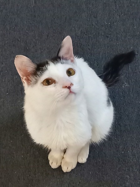 | 特徴(性格など) | 前髪をぱっつんした感じの柄がとっても愛らしい白い子猫です。 先住猫とも仲良くしています。 |