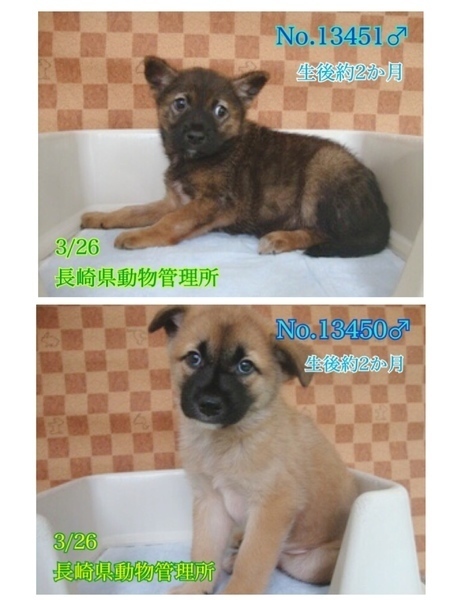 | 里親募集する理由 | 〜4/21追記〜 茶色君は里親様が決まりました! まだ生後2ヶ月位、野良ちゃんが生んだ可愛い雑種の仔犬、男の子兄弟です。 (4匹兄弟のうち2匹は里親様が決まりました) 人と接した経験が無く撫でられたり触れ合ったり、人からの当たり前の愛情を知らない子達でしたが少しずつ心を開いてきてくれています(^^) 突然親犬と離れ離れになり連れて来られて収容され、どんなに寂しく心細いか。 一日も早く一般の温かい家庭の中で過ごさせてあげたいです。 ※募集内容を熟読し、必ずご家族とよく相談をされた上、ご家族全員の賛同を得られてからのお問い合わせ をお願い申し上げます。 ⭐️ 外飼いでは無く、室内飼育で家族の一員として迎えて下さる方、「引き渡し方法」のところにあります【アンケート】にご回答・どちらの子をご希望かと共に、お問い合わせを頂けますよう、お願い申し上げますm(_ _)m 3/26(金)長崎県島原市有明町二ツ石で野良ちゃんが生んでいたところを保護され保健所収容、現在は管理所へ移送されてきています。この地域は野良ちゃんが多く、周りに民家の少ない山の中です( ; ; ) ♡No.13450 茶色君 ♡No.13451 黒茶君 収容当初からかなり怯えて怖がっていましたが、優しい職員さん方が大丈夫だよ、幸せになれます様にと毎日触れ合いながら、急に動いてもビックリして怖がる為、声掛けしながら一生懸命にお世話してくださっているお陰で、ちょっとずつ馴れてきてくれています。 やっと手からご飯を食べてくれる様になってきました!撫でてもジーっと固まっていて直ぐに隠れてしまいますが手からは食べますし噛んだりもしません。抱っこも大丈夫、尻尾を振って寄ってきたり後をついてきたり(^^) でもこちらから近付くとまだ怖いようで逃げますし初対面の人が抱っこするとお漏らししちゃいます(^◇^;) ご飯の時間になると茶色君は人がそばに居ても食べます(^^)黒茶君はまだ人前で食べず、人が居なくなってから食べています。 栄養不良に不衛生な環境からの保護・収容で、ノミダニに噛まれたのか真菌や疥癬、ブドウ球菌増などの皮膚炎なのか…2匹共皮膚を痒がっていて心配です。 (黒茶君は身体に脱毛部分も見られます) 譲渡後早急な病院受診、治療が可能なご家庭を希望しておりますm(_ _)m 現在は1日に2回、栄養価の高い良質な仔犬用のフードを食べています。 まだまだ幼い為、長時間のお留守番は出来ません。 健康な成長の為に良質なフードを与える事が可能な方、育てる自信と覚悟のある方、飼育経験のある方が望ましいですm(_ _)m 当分の間はかなり手がかかり大変かと思いますがまだ仔犬ですし、人間が愛情をもって接すれば、この子達はきっと徐々に新しい初めての家庭環境にも馴染んでいけると思います。 広い心で長期戦でもドンとこい^_^と仰って頂ける方、愛くるしいこの子達を尻尾フリフリ♫ニコニコの笑顔にしてくださる方、いらっしゃいませんか? どうぞ宜しくお願い申し上げますm(_ _)m ⭐️必ず室内飼育で、譲渡後速やかに病院受診、健康診断、混合ワクチン、生後4〜6ヶ月頃を目処に去勢手術をする事が可能なご家庭。 ⭐️まだまだ幼い為長時間のお留守番は出来ません。なるべくお留守番の少ない、沢山優しくスキンシップやコミュニケーションで触れ合っていただけるご家庭。 ⭐️トイレの躾は1からとなります。まだ仔犬なので躾は入りやすいと思われます。現在ペットシートでトイレの練習中(^^) 最初は何かと手がかかり大変ですが(マナーベルトやペットシートを用意など)覚悟と根気・理解で受け入れて下さる方m(_ _)m ⭐️犬の飼育経験があり自信のある方、愛情を持って犬をしっかり躾することが出来る方、朝晩のお散歩や運動にも充分時間をあてられる方、怖がってなかなかお散歩が出来ない時などには引きこもりにならぬよう、場合によりトレーニング教室なども視野に入れて考えてくださる方。何卒宜しくお願い致します。 ⭐️親犬不明の為どの位の大きさになるか分かりません、大きくなっても、(今のところ吠えませんが)吠えても大丈夫なご家庭。 中型〜大きめの中型犬程度に成長すると思われますฅ•ﻌ•ฅ 以上の点を踏まえ、この子達が置かれている状況、不安でいっぱいであろう心をご理解の上、全て受け入れ寄り添っていただけるご家庭で可愛がって頂きたいと祈っております。収容された全ての子達は身勝手な人間による被害者であり、何も悪くありません( ; ; ) 家族の一員として生涯大切にしてくださる優しいご家庭とのご縁が結ばれ幸せになれます様に♡ 家族の皆さんとずっと一緒に居られる暖かいお家が見つかります様に☆⭐︎ 残念ながら長崎県は平成28年度、29年度と殺処分数全国ワースト1位(30年度は3位)です。 ※県外、遠方の方でも譲渡の条件が合い、良縁に恵まれましたら里親になっていただけますのでどうぞ宜しくお願い致します♡ ⭐️引き出しや空輸、搬送など出来る限りの範囲内になりますがボランティアが