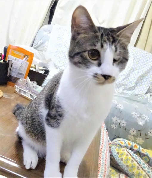 | 特徴(性格など) | 仮名:梅香ちゃん(メス) 毛色:キジ白 性格:人には馴れていて、スリスリ甘えてきます。これやってあれやっての要求がある為に膝の上に乗って、ブラッシングさせたりします。 ケージから出して欲しい時、ご飯の時間の時など鳴いて知らせます。 小さい頃の風邪が酷く、結膜がかなり腫れたので結膜が濁ってしまいました。 目の手術はしましたので、異常はないです。 活発に走っていたりすると、角にぶつかる事はありますが、生活に不自由はないようです。 他の猫達とは上手く付き合えるので、先住猫がいるお家でも大丈夫と思います。 ご飯好きなので、体重は重いですが、固太りです。 ノミ取り済 検便済 駆虫済 3種混合ワクチン済 猫エイズ・白血病ウィルス検査はともに陰性 避妊手術済 |