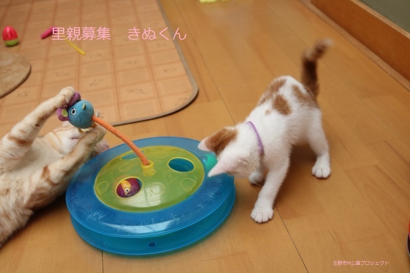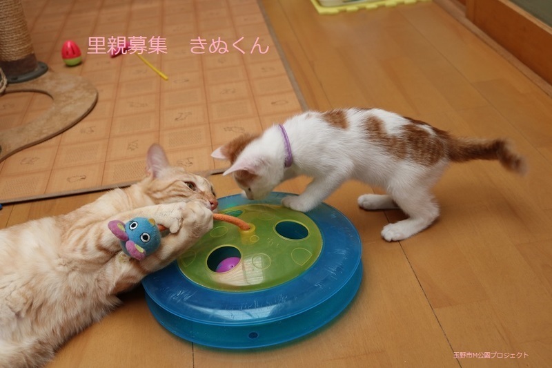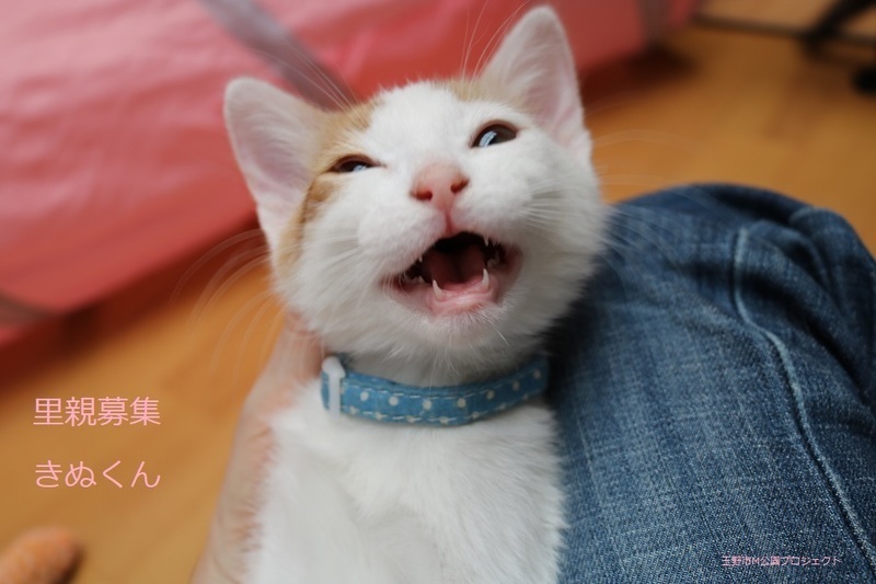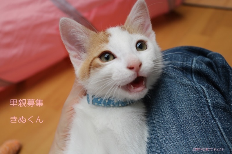 | 特徴(性格など) | 茶白猫、男の子、仮名:きぬくん 推定生後3ヵ月くらい、体重1.12kg(4/23現在) 健康診断済み、駆虫済み(ブロードライン4/23)、 トイレしつけ済み、 血液検査、ワクチン接種は、近日予定。 人慣れ抜群です。鳴いてアピールして、よく食べて兄弟の、まゆちゃんと元気に遊んでいます。 幸運を引き寄せるカギ尻尾です。 4/27、初回三種混合ワクチン接種。 4/27、ウイルス検査-エイズ・白血病共に陰性。 5/25、三種混合ワクチン追加接種。 7/12、去勢手術。 |