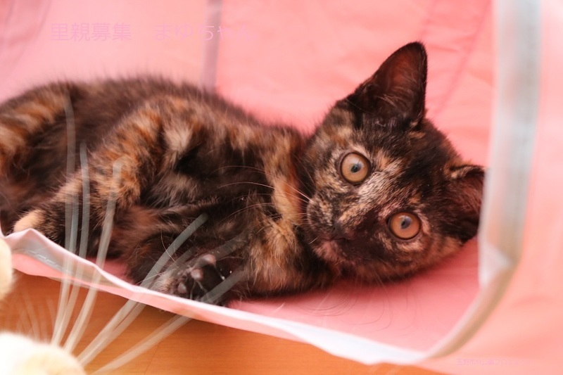 | 特徴(性格など) | サビ子猫、女の子、仮名:まゆちゃん 推定生後3ヵ月くらい、体重920g(4/23現在) 健康診断済み、駆虫済み(ブロードライン4/23)、 トイレしつけ済み、 血液検査、ワクチン接種は、近日予定。 人慣れ抜群です。鳴いてアピールして、よく食べて兄弟の、きぬくんと元気に遊んでいます。 幸運を引き寄せるカギ尻尾です。 4/27、初回三種混合ワクチン接種。 4/27、ウイルス検査-エイズ・白血病共に陰性(兄弟のきぬくんで実施) 5/25、三種混合ワクチン追加接種。 |