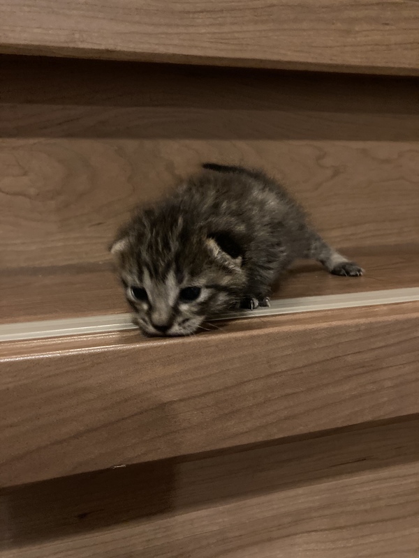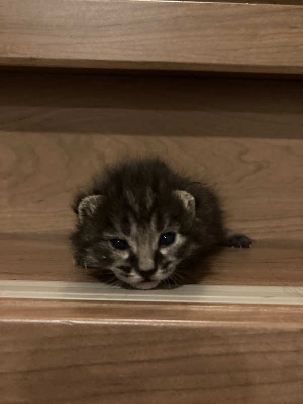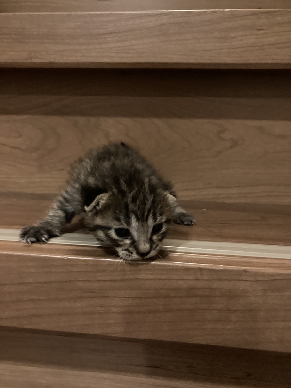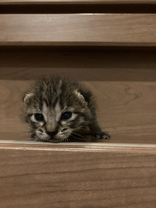 | 特徴(性格など) | キジトラ柄の赤ちゃん猫です。1匹は黒っぽく、もう1匹はグレーっぽいです。歯はまだ生えておらず、まだよちよちしか歩けません。赤ちゃん猫用のミルクを飲ませています。離乳が終わってからのお引き取りでも構いませんので、よろしくお願いします。 | ||