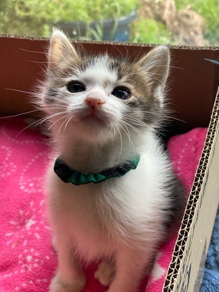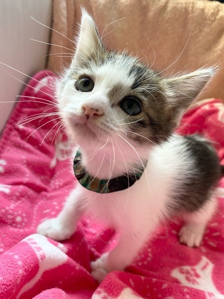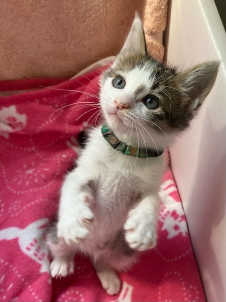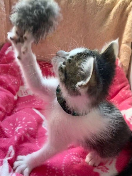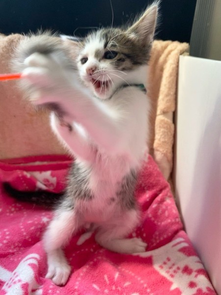 | 特徴(性格など) | 天真爛漫、陽気な「モヒート」くん❤ 生後10日ほど200g弱での保護、人の手で育てられ、素直で元気な甘えん坊♪ 遊んで貰うの大好き♪探検大好き♪お膝のうえ大好き♪ 現在ドライフードやパウチ練習中ですが、なかなか食べてくれず、一日4回離乳食中。 <推定誕生日:3月上旬> |