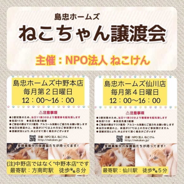 | その他(譲渡条件など) | ペットとしてではなく、生涯家族として猫を迎えて下さる方への譲渡となります。 原則ねこけん譲渡会等でのお見合いにてお申込みをお願いしております。 譲渡会には家族を待っている猫さん達が沢山参加します♪ ◆猫さんたちとのお見合について◆ 「ねこけん譲渡会」or「完全予約制個別お見合い」で気になる猫さんと会えます♪ 現在ねこけん譲渡会「虎ノ門会場」および「練馬会場」での定期開催は自粛しております。 2020年11月より島忠ホームズ中野本店および仙川店にて譲渡会を不定期開催しています。 譲渡会等イベント開催日程・詳細は、下記イベント一覧よりご確認ください。 ▼△▼イベント一覧▼△▼ https://satoya-boshu.net/event/?@button_name@=search&Event_MemberID=1288 ※事前のご予約などは必要ございませんので、ご家族皆様でぜひお越し下さい。 ※掲載中の猫さんであっても、当日の体調などにより譲渡会を欠席することがあります。 個別お見合いご希望の方はこちらの募集サイトの応募アンケート、もしくは下記連絡先よりお問い合わせください。 ▼△▼ねこけんの保護猫ちゃんたち▼△▼ https://satoya-boshu.net/foster/?@button_name@=search&FosterParent_MemberID=1288 ◆必ずお守り頂く事◆ ①終生飼養 ②完全室内飼養 ③年1回のご報告 ④ペット飼育可能な物件にお住まいであること 不妊去勢手術・医療費の一部負担をお願いしております。 ◆譲渡費用について◆ お届けエリアによっては往復高速料金(実費)を別途ご負担いただく場合がございます。 なお、交通費に関しましては正式譲渡に至らない場合であってもご返却できませんので予めご了承下さい。 ・ご希望の猫さんと家族になるまでの流れ ・譲渡時にかかる一部ご負担金などの詳細 ・譲渡契約書のサンプル等 下記URLに掲載しておりますのでご確認ください。 http://nekoken.jp/jotokai/joto-nagare/ https://nekoken.jp/jotokai/joutokibou/ ◆引き渡し方法◆ 1週間程度のトライアルの後、正式譲渡となります。 必ずご自宅までお届けします。 ◆お届け可能エリアについて◆ 応募可能エリア内であっても、遠方の場合アフターフォローの関係上お断りさせていただくことがございます。 ご心配な際は、前もって市区町村名や最寄り駅等をメールにてお問い合わせいただけますと幸いです。 お手数をおかけいたしますが、何卒ご了承くださいますようお願いいします。 [連絡先] ご不明な点、ご質問等ございましたらお気軽にお問い合わせください。 NPO法人ねこけん東京本部 https://nekoken.jp/inquiry/ nekoken@cat.email.ne.jp 担当:溝上・登坂 [ホームページ] http://nekoken.jp [Instagram] https://www.instagram.com/nekoken2222/ [ブログ・ボラ日記・YouTubeなど] https://linktr.ee/nekoken フォロー・チャンネル登録よろしくお願いします! |