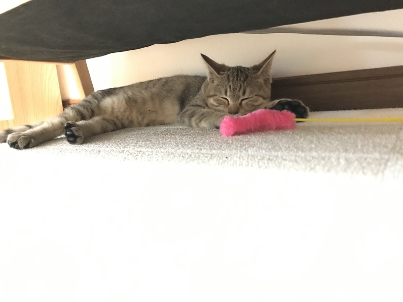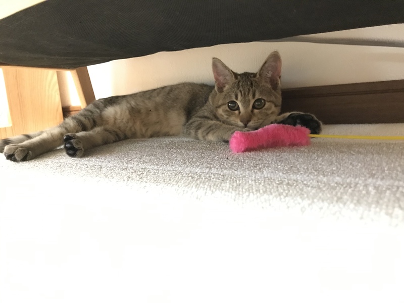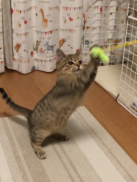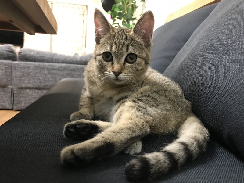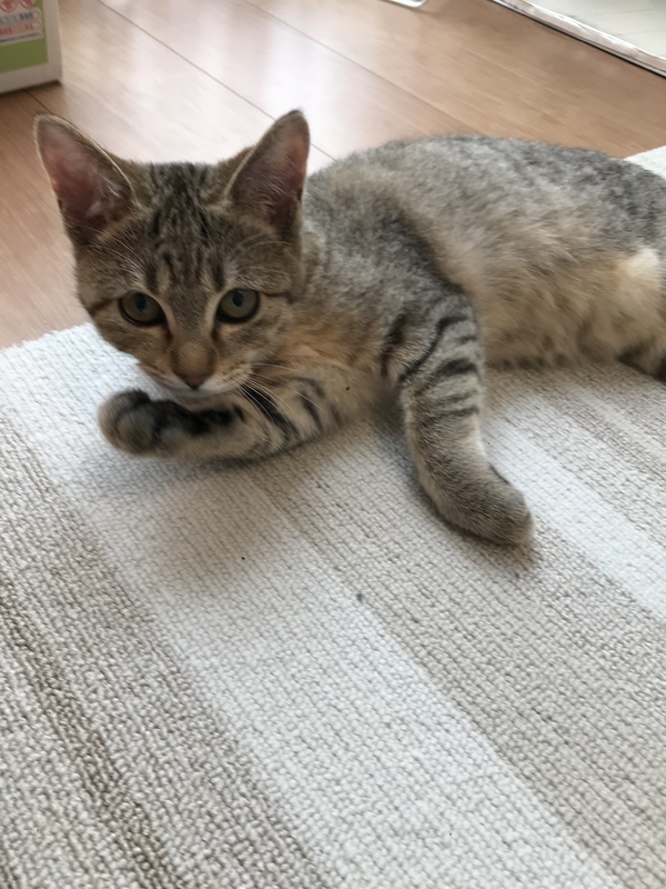 | 特徴(性格など) | キジ柄の女の子です。 とても人懐っこく、来客にも臆せず膝の上に乗ったり手を舐めにいったりします。 もちろん飼い主の膝やお腹の上に乗ったり、顔や手もよく舐めにきます。 ちょっと臆病なところもありますが、慣れるのは早いタイプだと思います。 痩せ型でスマートな体型です。 |