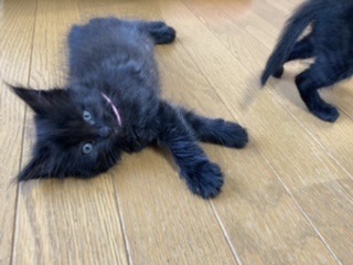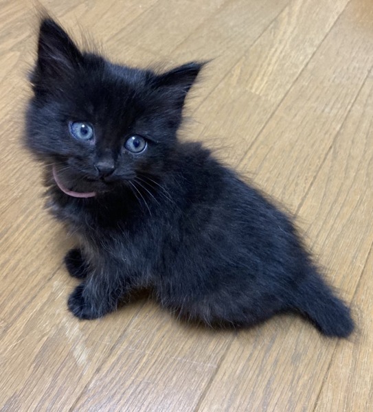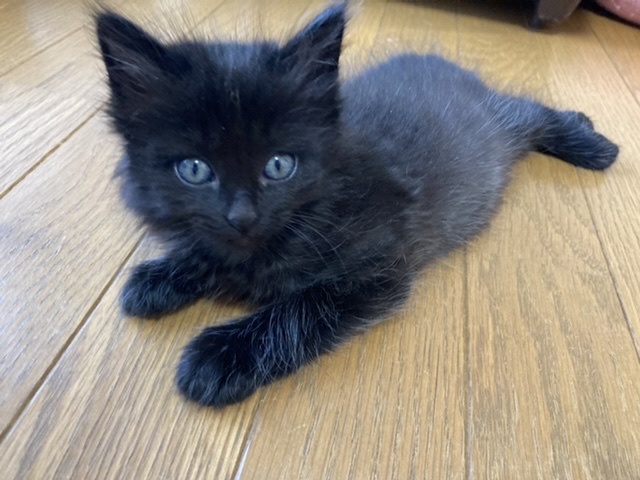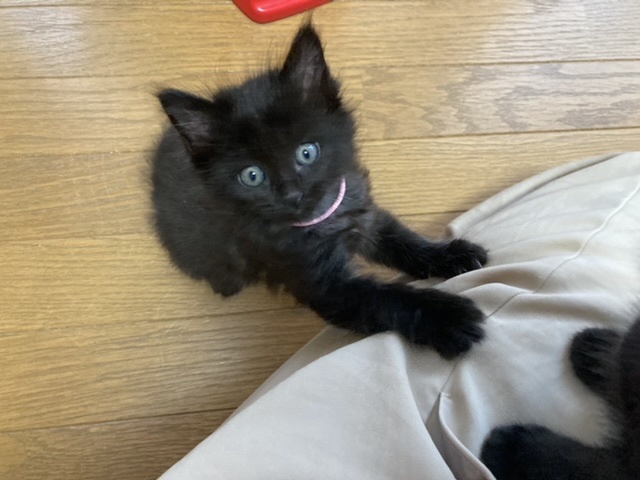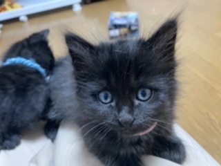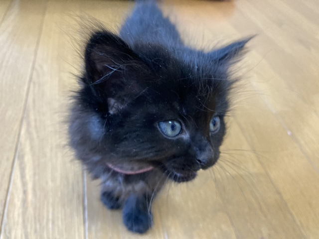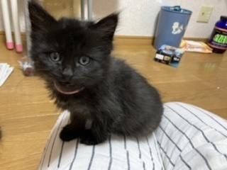 | 特徴(性格など) | ※姉妹2匹で貰っていただける方※ 仲良しのピンク首輪の短毛の子と2匹でもらっていただきたいと思っています。 兄弟一緒だと、お家にも慣れやすいですし日中お家に人がいないお家でも寂しくありません。 ↓姉妹はこちらから https://satoya-boshu.net/foster/detail.php?@DB_ID@=316729 【見た目】 ピンクの細い首輪をした長毛の子です。 体重 450g(4月29日時点) 被毛が長く、もこもこしています。 毛の一本一本が細く、触り心地は最高です。 黒猫は長毛だとシルバーが混ざるようで、この子もお腹など、ところどころシルバーが混ざっています。 肉球の隙間からもぽわぽわ毛がはみ出しているので、そこそこの長毛になりそうです。 しっぽは短く、ウサギのようにピコピコ動く様子がたまりません。 何となく胴が短く感じます。 肉球は茶色で、目の色はシルバー?黄色?です。 指の毛が長いので、よく滑っています。 怪我防止のために、マットやカーペットを敷いた方がいいかもしれません。 【性格】 身体は小さめなのですが、兄弟の中では一番アクティブで、元気いっぱいです。 とてもマイペースな性格で、まったく物怖じしません。 保護後、兄弟みんなが怯えている中で一匹だけ平気な顔で外に出て、探検していました。 人慣れしており、膝や足の上にもガシガシ登ってきます。 始めて見る物にも興味津々で近付きますので、新しいお家でもすぐに馴染めると思います。 遊ぶのが大好きで、おもちゃを振ると駆け寄ってきます。 兄弟とのプロレスもしょっちゅうしていますが、機敏な動きでみんなを翻弄しています(笑) できれば、兄弟一緒で家族になれると嬉しいにゃ(’ω’=) 【健康状態】 動物病院でのノミダニ駆除や診察は済んでいます。 月齢の関係で、感染症等の検査は行っていません。 |