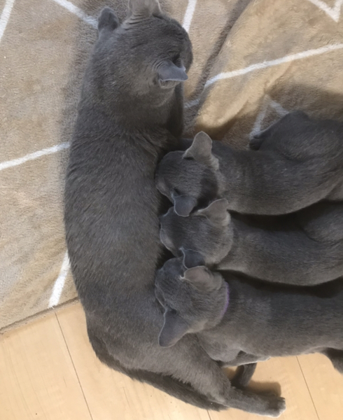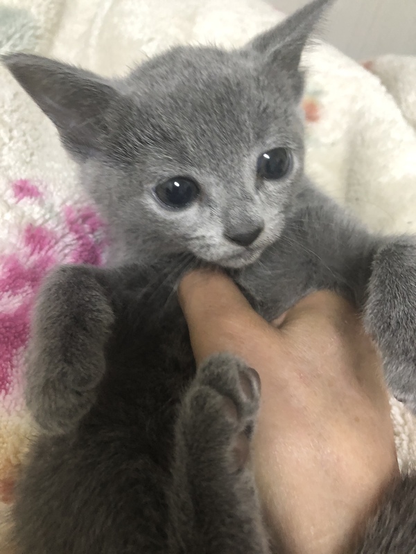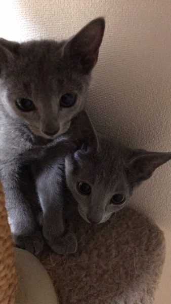 | 特徴(性格など) | 両親共にロシアンブルー。純血統種です。 とても人懐っこく、元気いっぱいです! ロシアンブルーの特徴である、ロシアンスマイル、美しい毛色、ダブルコートの毛並みが顕著にあらわれた美しい子達です。 トイレの躾、離乳食も完了しています。 現在はグレインフリーのドライフードとウェットの両方を食べてます。どのメーカーのものも好き嫌いなくパクパクモリモリ食べます。 |