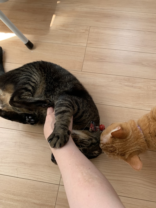 | 特徴(性格など) | 赤ちゃんの時に保護した兄妹猫の兄?です。 とても優しく1度も噛んだり引っ掻いたりしたことがありません。 甘噛みはあります。 撫でられることが大好きです。 子供が無理やり触っても全く怒らずされるがままです。 ベランダから脱走したことがあり、ベランダに出さないようにしたら外に出たくて鳴くことがあります。 2匹とも飼える方がおりましたら優先したいです。 |
