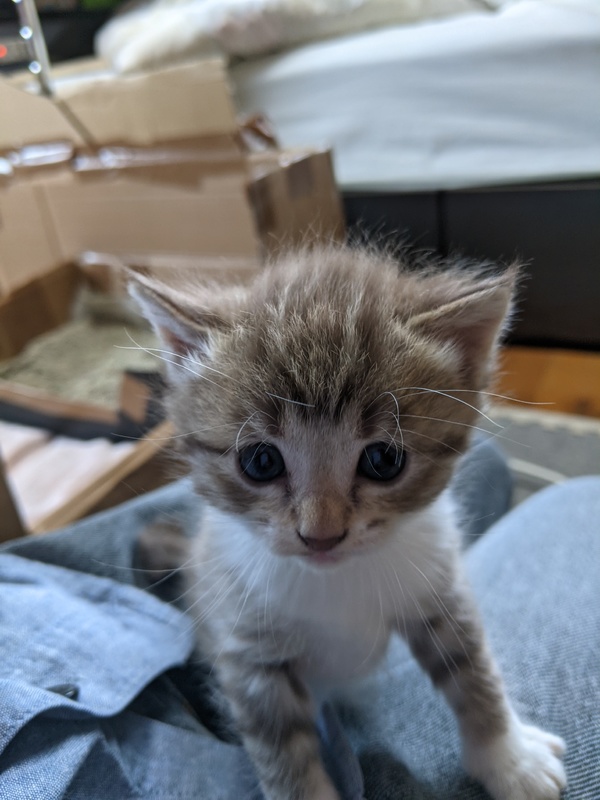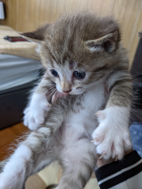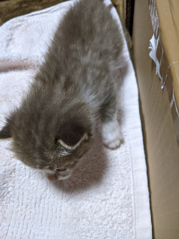 | 特徴(性格など) | 1ヶ月前に生まれた子猫です。 そのうちのグレー色の子です。 少し大人しめですが、じゃれあったり元気な様子もあります。 自宅で生まれたので人にはすぐ慣れると思います。 離乳食も食べ始め、トイレも覚えています。 |