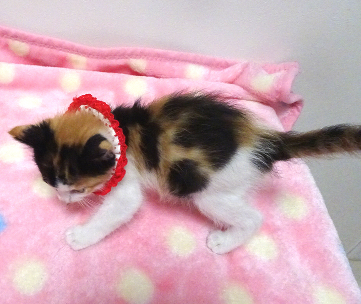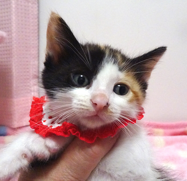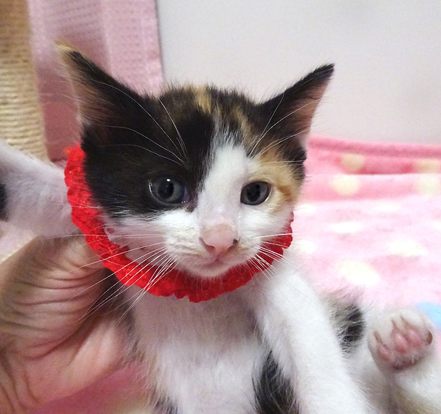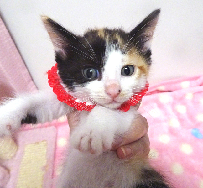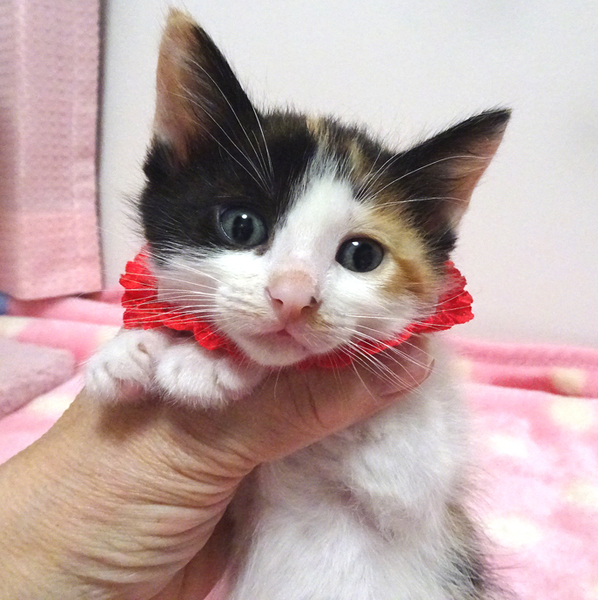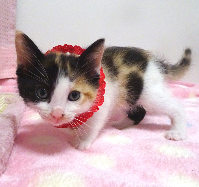 | 特徴(性格など) | 【猫の仮名】千色(ちぃ)ちゃん (担当 松嶋) 【毛色・柄】三毛、長くて真っすぐなシッポ 家猫の母親の元で育ったので栄養状態が良く、きれいな子です♪ 小さくてもトイレができる賢い子です♪ 猫を飼うのが初めての方でも大丈夫です♪ 走っても大丈夫なペット可のお住まいで、猫だけのお留守番が長時間でないご家族を募集しています。 元飼い主の希望により、お一人暮らし、同棲中の方、ご高齢の方には譲渡できません。 |
