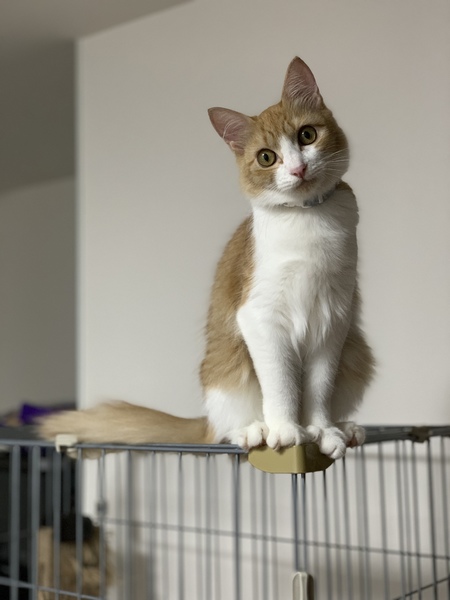 | 特徴(性格など) | 長毛の茶白の女の子です。 三姉妹の中で1番怖がりですが、その分慣れると人が好きです。抱っこして撫でるとゴロゴロいいます。 |