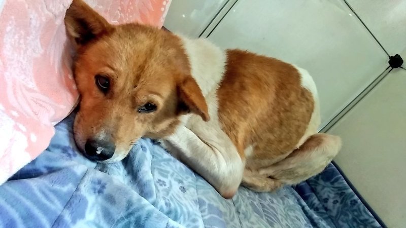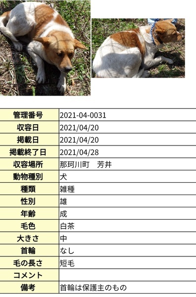 | 特徴(性格など) | 茶色と白のブチの子です。 体重20㎏。大きめの中型犬ぐらいのサイズかと思います。 臆病ですが撫でられますし人の手からごはん、おやつ食べます。 怖がるときは唸ったり吠えたりしますが今のところ噛みつきはありません。 人慣れは早い方かと思います。 |