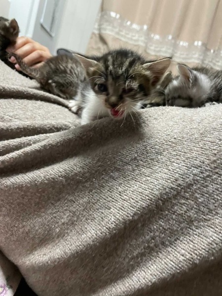 | 特徴(性格など) | まだ生後2〜3週間くらいの子達です。 哺乳器でミルクを飲んでます。 キジシロの女の子 片目が風邪により癒着してしまっていましたが、治療により良くなってきています。今後も目薬などの治療が必要です。 キジトラ男の子、黒の女の子 風邪気味ですが、元気です。飲み薬を飲んでいます。 |