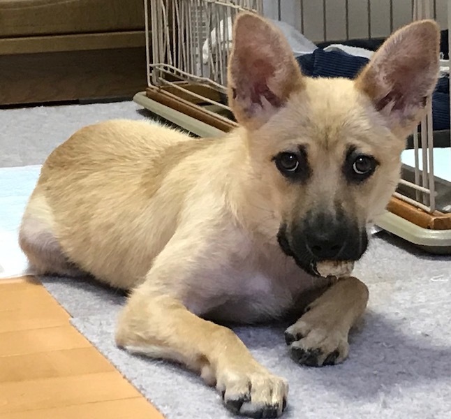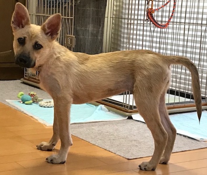 | 特徴(性格など) | MIX子犬の『たえ』です。 (ちばわんHP掲載番号No.4182)←申込時は必ず犬の名前とこの番号を記載し、下記内容をよくお読みの上ちばわんHPからお願いします。 ※「生まれた月日」は推定です。 【毛色】 茶 【体重】 9㎏(5/13現在) 【状態】ワクチン2回接種済、ノミ・ダニ駆除済、駆虫済、マイクロチップ装着済、狂犬病予防接種済 【人馴】問題なし 【性格・その他】 潤んだ大きな瞳がチャームポイントの女の子です。 室内での生活経験不足のため、今はまだサークル内が安心するようですが、オヤツの気配がすると走り寄って来たり、おもちゃで遊んだり、抱っこしていると膝の上で眠ったりと家庭犬として成長しつつあります。 攻撃的な面は全く見られず、抱っこもできますし身体のどこでも触れます。 犬は大好きで遊びたいようですが、かなりしつこいので先住犬のいるお家では相性を見る必要があります。 食事は、1日3回ドライフードを与えています。食事中に食器を触っても怒りません。小さいオヤツでも手から優しく食べられます。 食欲は旺盛で、ご飯前は待ちきれずに吠えていましたが、今は静かに待っていられます。 散歩では車やバイクが怖いようですが、その場で伏せてやり過ごせば尻尾ブンブンで歩きます。現在、人と一緒に歩く勉強中です。 不意のシャッターの開閉音や多数の人が歩いて来るのを非常に怖がり、後ずさりしたりと動きが読めませんので逸走防止には十分な注意が必要です。 トイレは、大小ともにほぼシートでできます。車酔いはありません。 今のところ、人が困るようなイタズラはありませんが、まだ幼齢ですので、「たえ」と向き合う時間をたくさんとってくださるお留守番の少ないご家庭を希望しています。成長後の大きさは予測できませんので、サイズ制限のあるお家には向いていません。 引き続き完全室内飼育で、脱走・逸走防止への細心の注意、毎年のワクチン接種やフィラリア予防などの健康管理を必ずお約束していただけるご家庭で、終生家族の一員として可愛がってくださる方からのお問い合わせをお待ちしております。 なお大変申し訳ありませんが、単身の方や同棲カップル、主にお世話をなさるのが高齢の方のご家庭の場合はお断りさせていただきますのでご了承ください。 【預かり場所】 神奈川県川崎市 【日記】104Eの部屋 http://blog.livedoor.jp/t104e/ 【お申込み】 ちばわんの保護犬『たえ』への申し込みはhttp://www.chibawan.net/contactform_dogからお願いします。 |