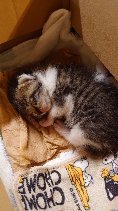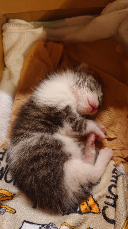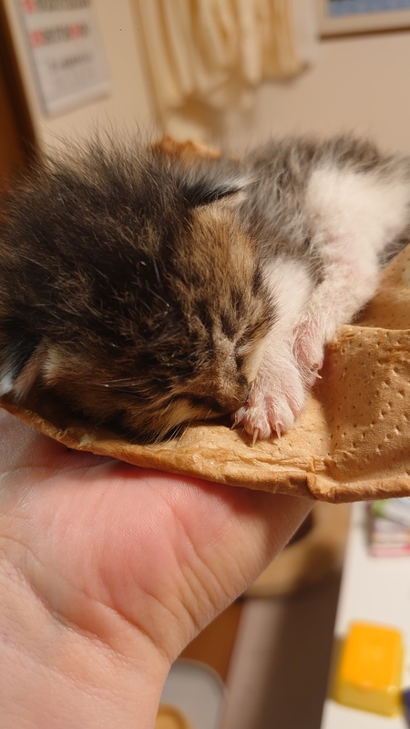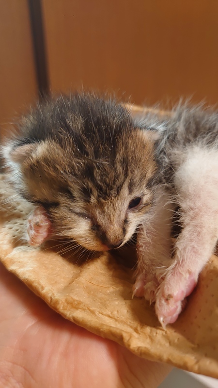 | 特徴(性格など) | 不明ですが、生後1週間前後です。 白黒茶のキジだと思います。 今現在左目だけ開いていて、右目は少しずつ開いてきています。 ミルクを飲んで、よく寝ます。 |
