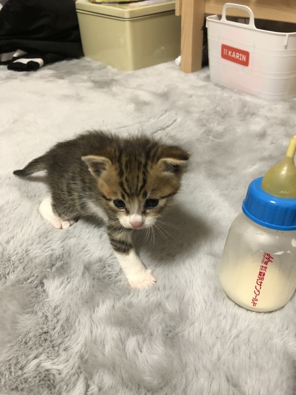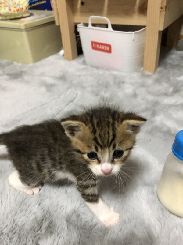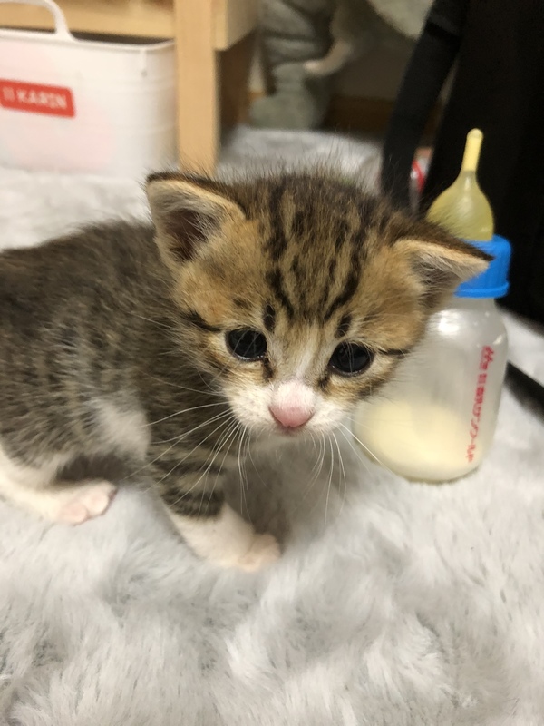 | 里親募集する理由 | 犬の散歩の途中、側溝にはまって、ずぶ濡れでうずくまっていました。 病院に連れて行って、点滴をしてもらいました。 生後3週間位でしょうと言われました。 元気になり、ミルクでふやかしたフードを食べられるようになりました。 うちにはすでに3匹猫がいます。これ以上飼うのは無理なので、可愛がってくださる方に引き取ってもらいたいです。 |
