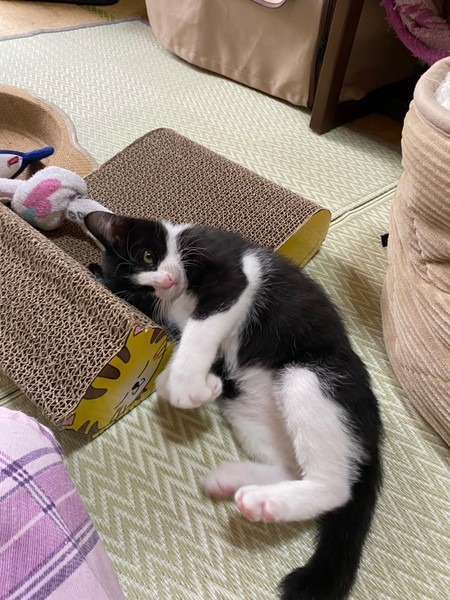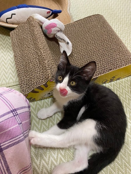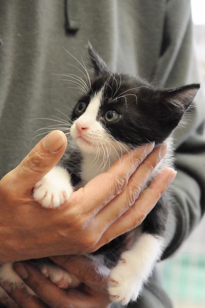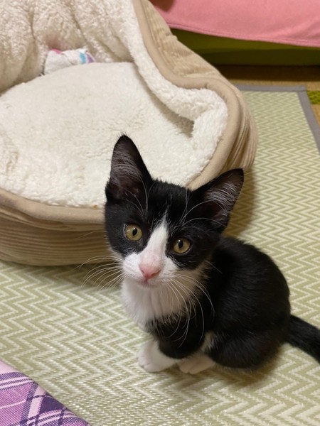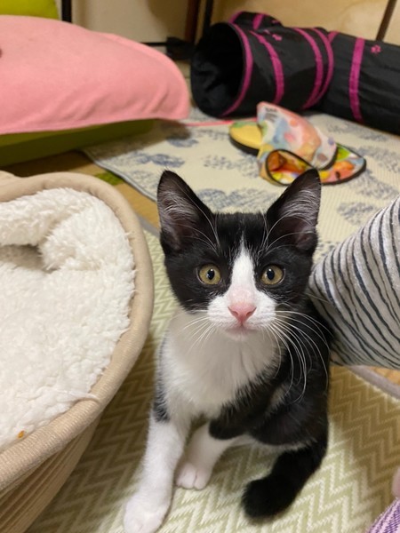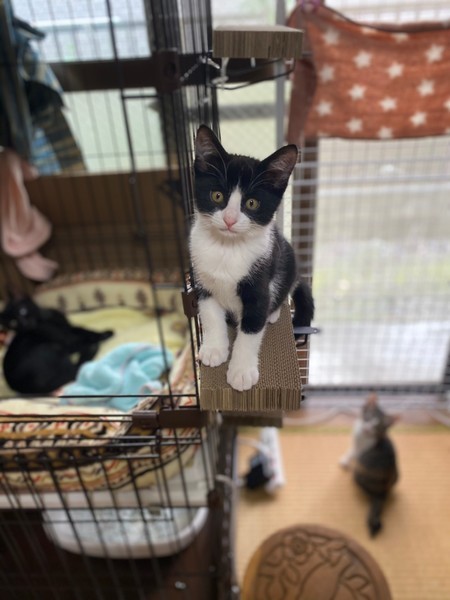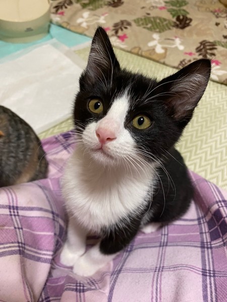 | 特徴(性格など) | 2021.3.1生まれ(推定) 毛色:白黒 甘えん坊でマイペースな食いしん坊将軍な男の子です。 人が好きでサイレントニャ~を発しながらお膝から肩に乗りたがります! 兄妹達とよく走り回り本気でニャンプロに立ち向かっています。 ☆エイズは陰転しましたが、白血病は陽性のため、 先住猫さんのいないお家、または同じく白血病の猫さんがいるお家や 兄妹での譲渡を希望いたします。 できるだけお留守番が少なく、細やかに体調を見ていただければ幸いです。 |