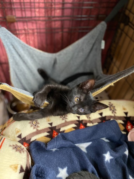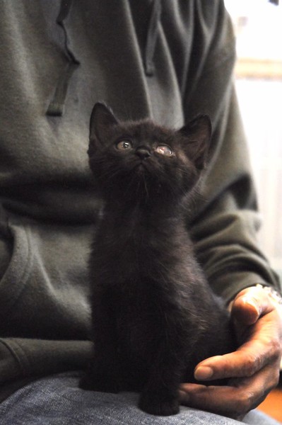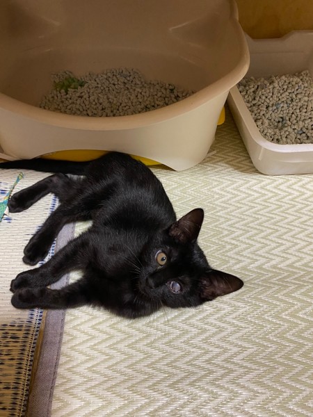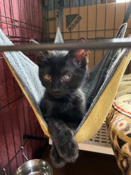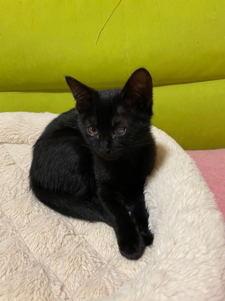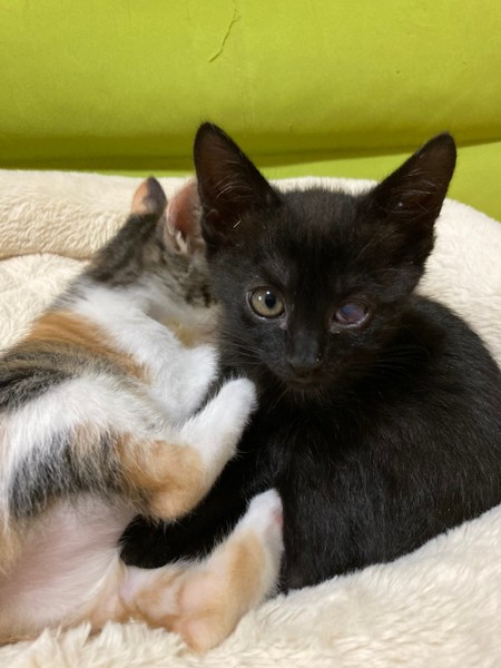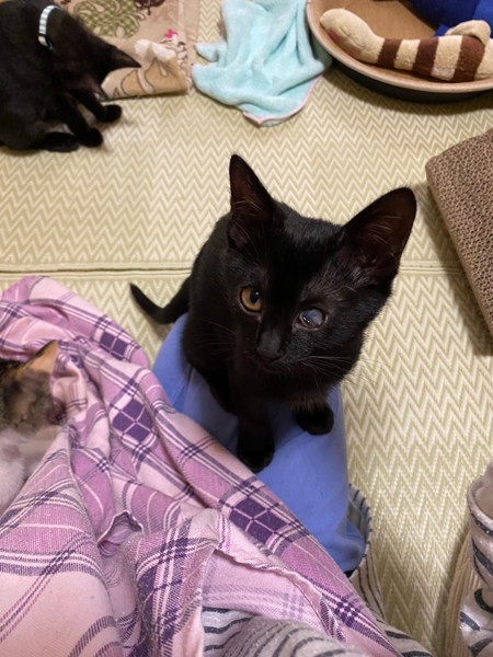 | 特徴(性格など) | 2021.3.1生まれ(推定) 毛色:黒 結構自由人タイプの女の子です。 ササッとご飯をすませ遊びや探検したりと、 細っこい感じなのにとにかく元気な子です。 そして眠くなるとササッとベッドに直行しちゃいます。 保護した時にかなりひどい風邪をひいていたのが原因か、 左目は癒着してしまい、視力自体残っているかはわかりませんが、 片目でも不自由なく元気に遊んでいます。 ☆白血病は陽性のため、先住猫さんのいないお家、 または同じく白血病の猫さんがいるお家や 兄妹での譲渡を希望いたします。 できるだけお留守番が少なく、細やかに体調を見ていただければ幸いです。 |