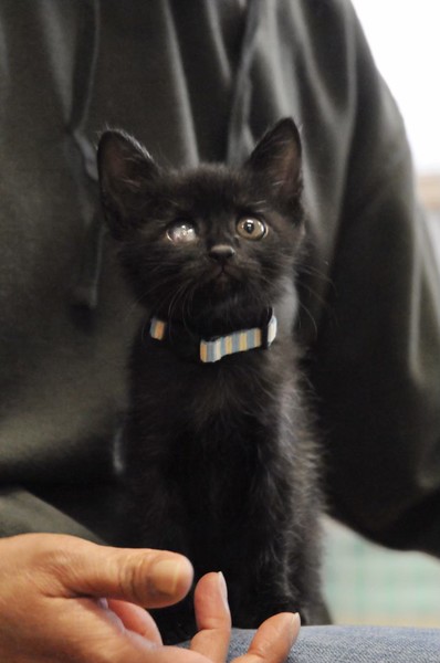 | 特徴(性格など) | 2021.3.1生まれ(推定) 毛色:黒 まず遊びや探検 ご飯はそれから⁉️という、 我が道を行くタイプの女の子です。 人が好き♡お膝大好き♡で、兄妹達とお膝の奪い合いに 毎日負けまい!と頑張って立ち向かってます。 保護した時にかなりひどい風邪をひいていたのが原因か、 右目は癒着してしまい、視力自体残っているかはわかりませんが、 片目でも不自由なく元気に遊んでいます。 ☆エイズは陰転しましたが、白血病は陽性のため、先住猫さんのいないお家、 または同じく白血病の猫さんがいるお家や 兄妹での譲渡を希望いたします。 できるだけお留守番が少なく、細やかに体調を見ていただければ幸いです。 |