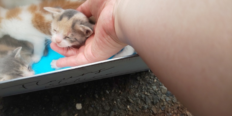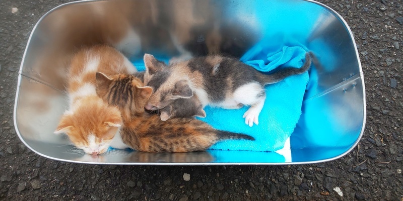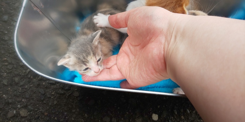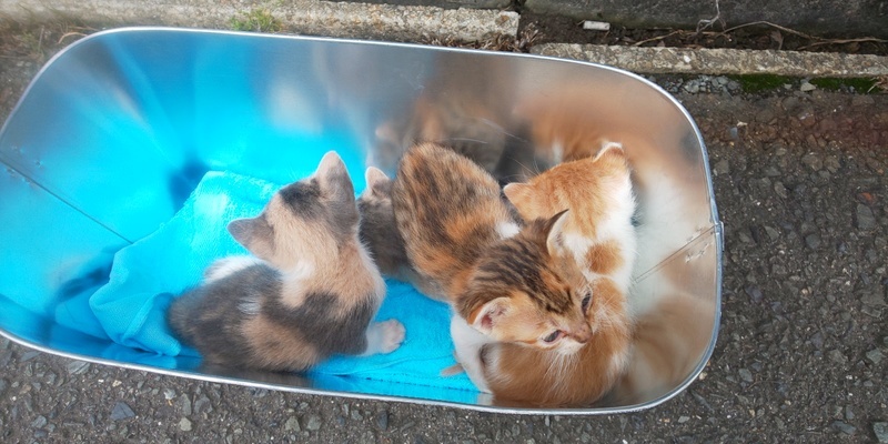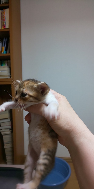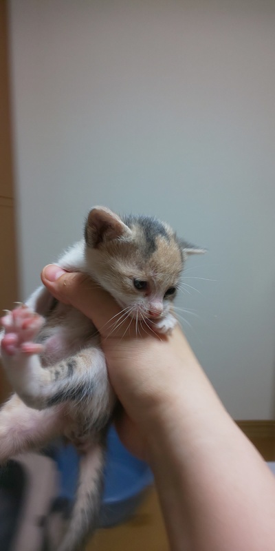 | 特徴(性格など) | 三毛(おとなしい)、三毛(活発・気が強い)お腹に出来物あり、茶トラ風味(マイペース)、オレンジ白(マイペース)の4匹です。 性別はまだ小さく判別不能です。 追記、 オレンジ白ちゃんオスかと思われます(希望多数) あとは全てメスのようです。 4匹とも乳歯生えてて、ミルクの容器をギリギリ噛みながら飲んでたので、離乳いけそうだな、ということでカルカン子猫用パウチをスプーンで与えてみました。少しずつ食べてますので、お渡しまでに離乳できるかもしれません。 |