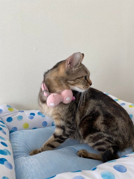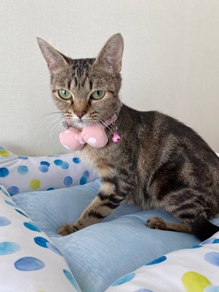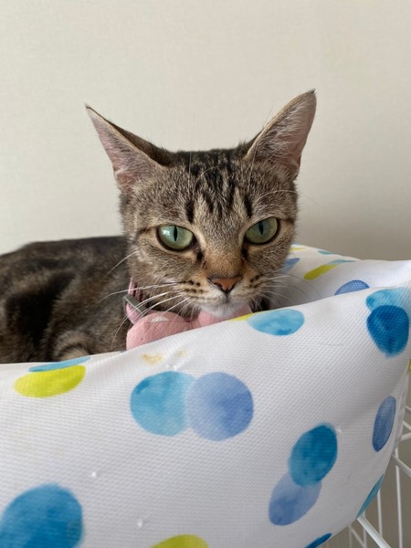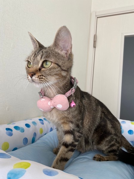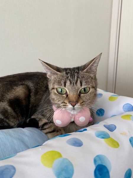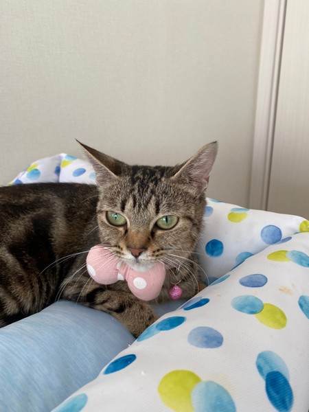 | 特徴(性格など) | 2020.6.11生まれ(推定) 毛色:キジトラ 多頭飼育崩壊から保護されたチョコシリーズのうちの1匹。 大きい目と小さな顔が特徴です。 小柄ながらよく食べ、とっても人懐っこい女の子です♡ おしゃべりで、名前を呼んだり話かけると返事をしてくれます。 おもちゃも大好きです。 初めは怖がりな様子があると思いますが慣れるとスリスリしに来てくれます。 |