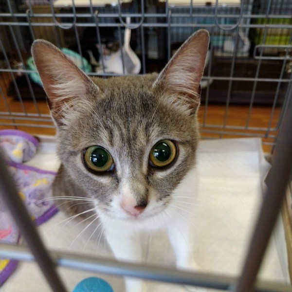 | 特徴(性格など) | 2017.3.3生まれ(推定) 毛色:サバ白 淡いグレーとフワフワの白い毛並みがとっても可愛らしいサバ白の女の子♀ 大きなクリクリのお目目がチャームポイント♪ なのですが、実はみみの両目は生まれつき見えていません。 それでも、そんな事を感じさせないくらいクリクリの目をキラキラ光らせながら、 いつもこちらをまっすぐ見つめてくれます♡ 人が大好きでとっても甘えん坊のみみは、いつもでも人の傍に近づいてきてピトッ♡ 寝る時にも、一緒の枕でピッタリと寄り添いながら甘えてくれますZZZ そっと傍にいてくれるだけで癒し効果を発揮するとってもカワイイ女の子です☆ |