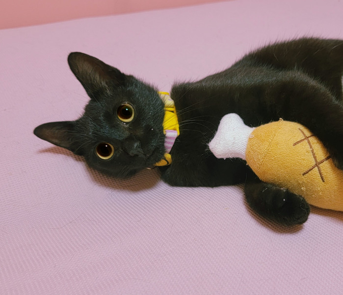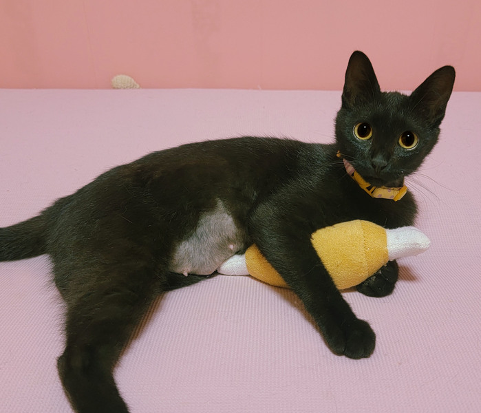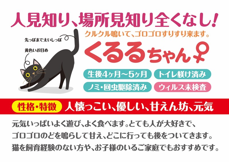 | 特徴(性格など) | 【健康状態】 よく食べ、よく遊び、元気いっぱいです♪ シャンプー、ブロードライン(駆虫)済み。 トイレも問題ありません。 5/12 ・避妊手術済み ・ワクチン(3種)接種済み ・ウィルス検査済み エイズ・白血病ともに陰性で問題ありませんでした。 ※お引き渡しの際に、診療明細・領収証・ウィルス検査結果・ワクチン接種証明書をお渡しいたします。 領収証に記載の金額以外は一切請求いたしませんので、ご安心くださいませ。 【性格・特徴など】 生後5ヶ月ぐらいの、かわいい黒猫の女の子です。 地域猫活動エリア内に捨てられていたところを保護いたしました。 驚くほど人見知り・場所見知りゼロ! とっても社交的な性格をしています。 とにかく人が大好きです♡ クルル~と鳴きながら、いつでもどこでも後ろからトコトコついてきます^^ 尻尾は幸せを引っ掛ける鍵しっぽ。 小顔さんなのにお目目クリクリな姿が、まるで魔女の宅急便のジジのようです♪ (5/12に避妊手術をしたばかりなのでお腹ツルツルですが、少しずつ毛が生えてきています) 突然公園に放されてしまい、他の猫たちの縄張りに入ることができないようでしたので保護いたしました。 人に裏切られたかもしれないのに、人を心から信頼しているとても優しい子です。 爪を切っても、シャンプーしても、病院に連れて行っても、爪を立てたり、噛んだりすることはありません。 題名のとおり、本当に人と暮らすために生まれてきたような子です。 とても狭い場所で飼われていたのか、保護当時はオモチャの遊び方はもちろん、キャットタワーの登り方すら分かっていない状態でした。 今では運動神経バツグン!遊ぶのも大好きです♪ 突然捨てられて怯えていたため、他の猫ちゃんには少し怖がりますが、人は大好きです。 生後2~3ヶ月のうちは噛みグセがあったりなど、まだまだ本来の性格が分かりづらいこともありますが、この子は性格も落ち着いてきて穏やかなのでとても飼いやすい子だと思います。 初めて猫ちゃんを迎えられる方や、お子様がいらっしゃるご家庭でも安心して迎えていただけると思います^^ |