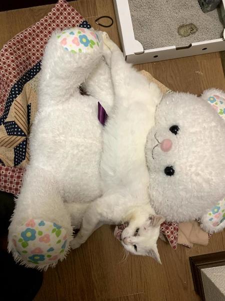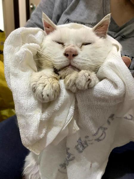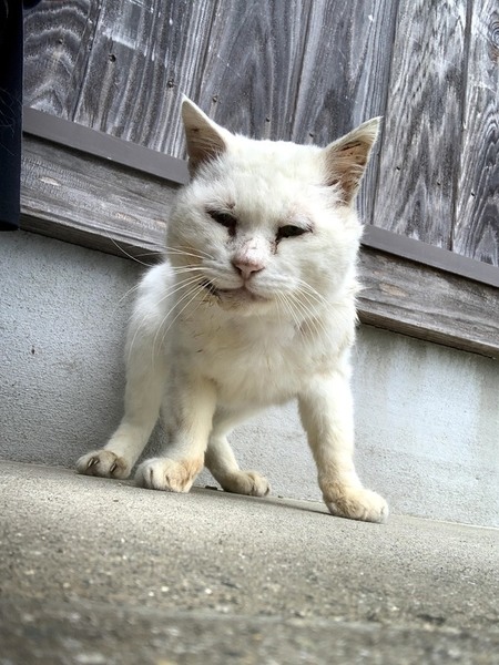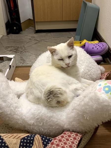 | 特徴(性格など) | 白猫。 前足は口からの膿で汚れていますが、お風呂に入れたら少しは取れました。 未去勢です。 5/2保護時の体重3.56kg。 5/13→4kg 背中を撫でると骨がゴツゴツしてます。 推定年齢10歳位。 尻尾が無いかと思ったら、とても短い鍵しっぽでした。 急に触ったり大きな声や動作には怖がりますが、話しかけながら触ったり、じっとしていると爆音ゴロゴロで寄ってきます。 基本なでなで大好きな子です。 すぐにお腹を見せてゴロゴロ言ってます。 お風呂も打たせ湯の様に座ったまま寝る子です。 爪切り等一通り出来ました。 滅多に怒る事はありませんが、他の猫に対して敵対心剥き出しです。 (我が家の先住の食いしん坊が餌を横取りしようとした為…) 野良歴が長いのか餌を取られると思ったら猫パンチしたり突っかかって行こうとします。 1匹飼いでお願いします。 軽やかにジャンプして柵等乗り越えます(笑) オモチャは怖がります。 慣れたら呼ぶと何か喋りながら寄ってきます。 トイレは1度教えたらきちんと覚えました。 ◆健康状態 猫エイズ陽性ですが、ご飯も食べ、とても元気です。 右下顎が皮膚が溶けた様にえぐれていて、保護当初は膿が混じったヨダレが凄かったです。 2週間効く抗生剤と炎症止めのお薬を飲んで膿も治まってきました。(2回目) 5/13→肉が盛り上がって顎が再生してきた様です。 このまま再生するのを待てば綺麗になるかと思われます。 見た目に囚われず、この子自身を可愛がってくれる方。 |