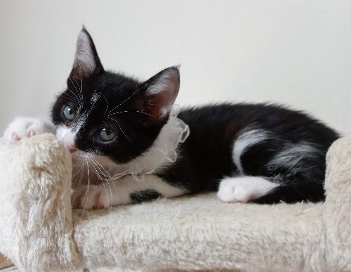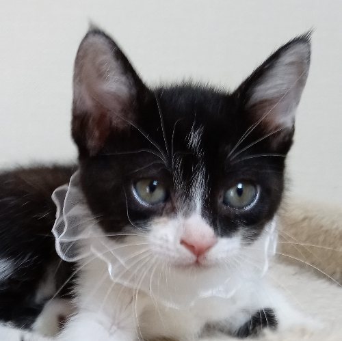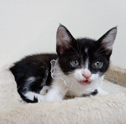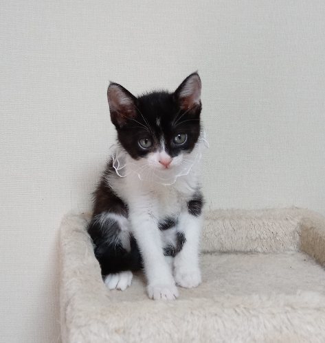 | 特徴(性格など) | 物怖じしない性格です。体の白黒の模様がとてもきれいで、すらりとした体つきです。少し小さな子猫と一緒に生活していますが、その子たちにはやさしいお姉さんです。 | ||