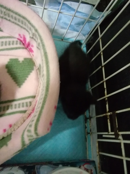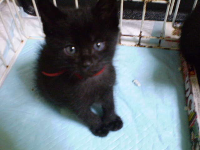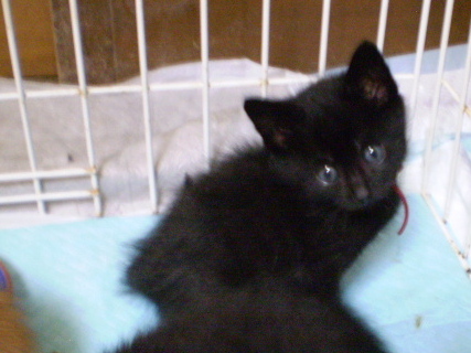 | 特徴(性格など) | クロネコです。多分メスです。動画の赤いリボンの子です。おとなしいめの子で、ゲージの隙間にこちょんいたりします。食後良く他の子の毛づくろいをしたり、長女気質な感じです。 | ||