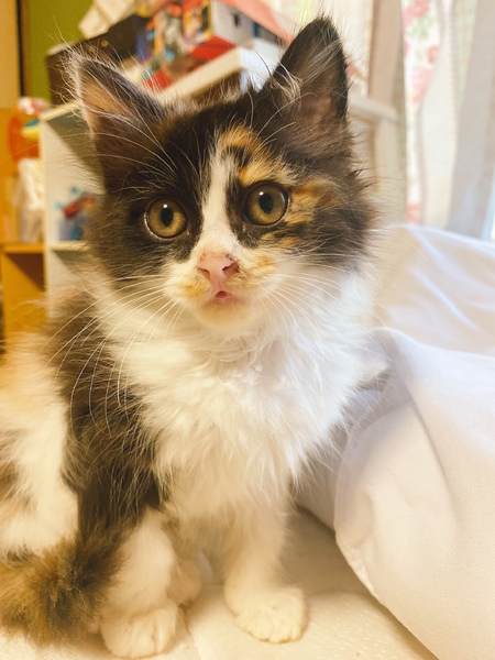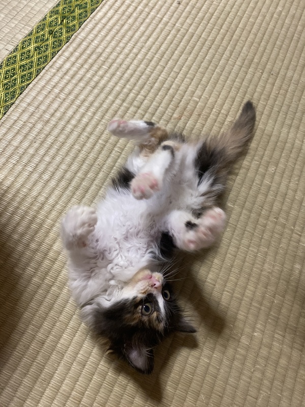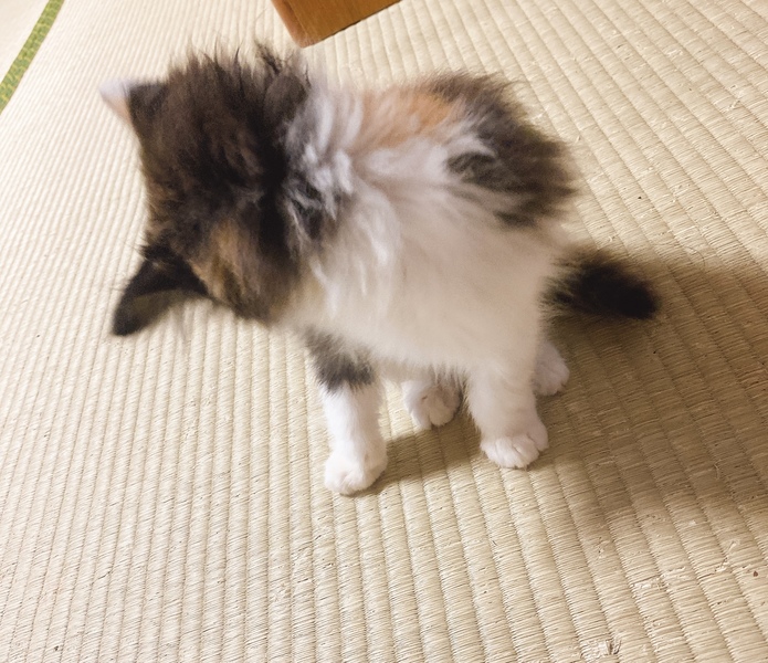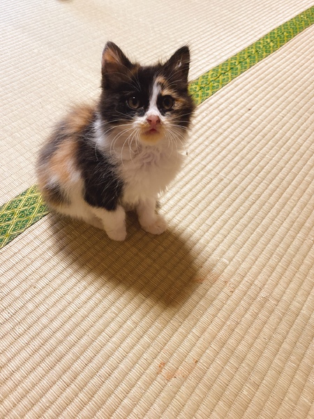 | 特徴(性格など) | 黒、茶色、白の斑模様 活発に遊びよく寝る、人馴れしていないのでたまに逃げる 一緒にいるとすぐ慣れて一緒に寝るようになる |