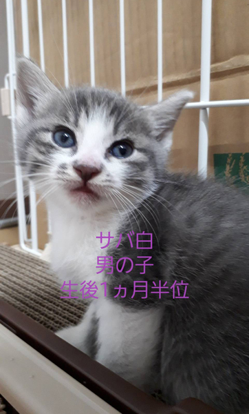 | 特徴(性格など) | サバシロ(仮名らいくん) お母さん大好きの甘えん坊です 姉弟とお母さん猫と親子で過ごしてます。 ワクチン接種予定です。 レボリューション済み。 エイズ白血病検査お母さん猫でしてます 共に陰性です |
