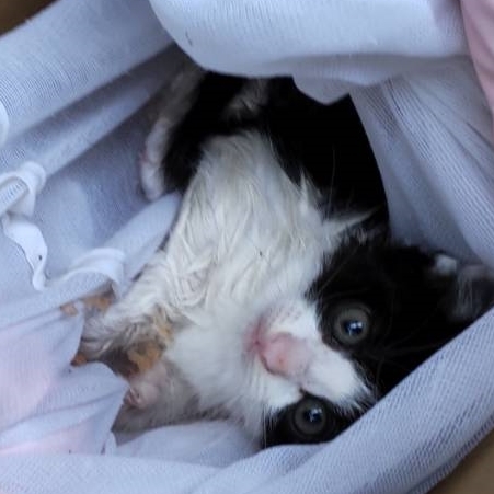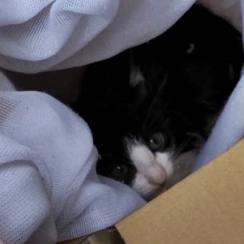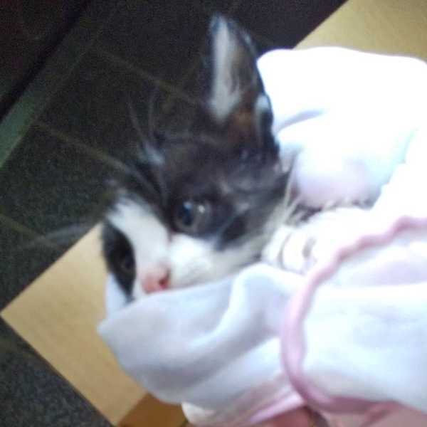 | 特徴(性格など) | 黒ぶちです。抱っこ可能です。見ていたり撫でていると、静かにして目を閉じていることが多いですが、誰も居なくなると、こそこそと動いている音がします。 病気のような症状は見当たらず、元気です。目はかなりはっきり開いていますので生後2~3週間くらいと思われますが詳細は不明、よちよちですが歩きます。狭い場所や隙間に入りたがります。 |