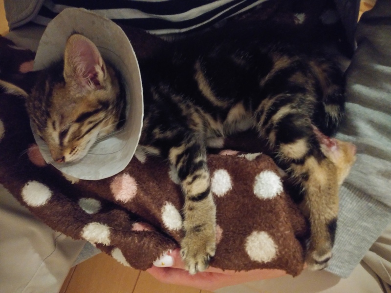 | 特徴(性格など) | 道路上で怪我しているところを保護しました。 目と足に怪我があり、動物病院にてお薬処方して貰っています。 足の怪我は大したことはなく元気に走り回っていますが、目の怪我はカラスにつつかれたらしく治っても傷は残るだろうとの事でした。 最初は警戒していましたが家に来た次の日には甘えたりじゃれたりしていてとても懐っこいです。 猫ちゃんを飼ったことがないので柄についてあまりわからないのですがトラ柄?だと思います! |