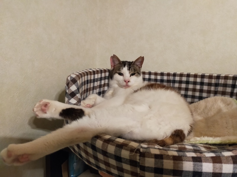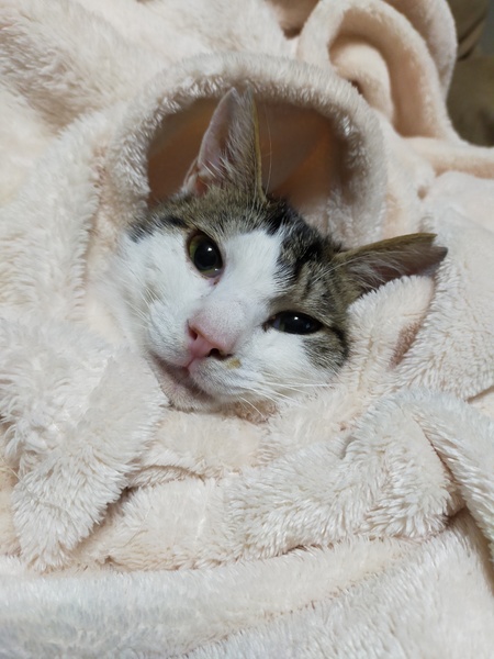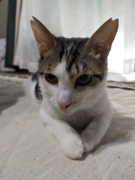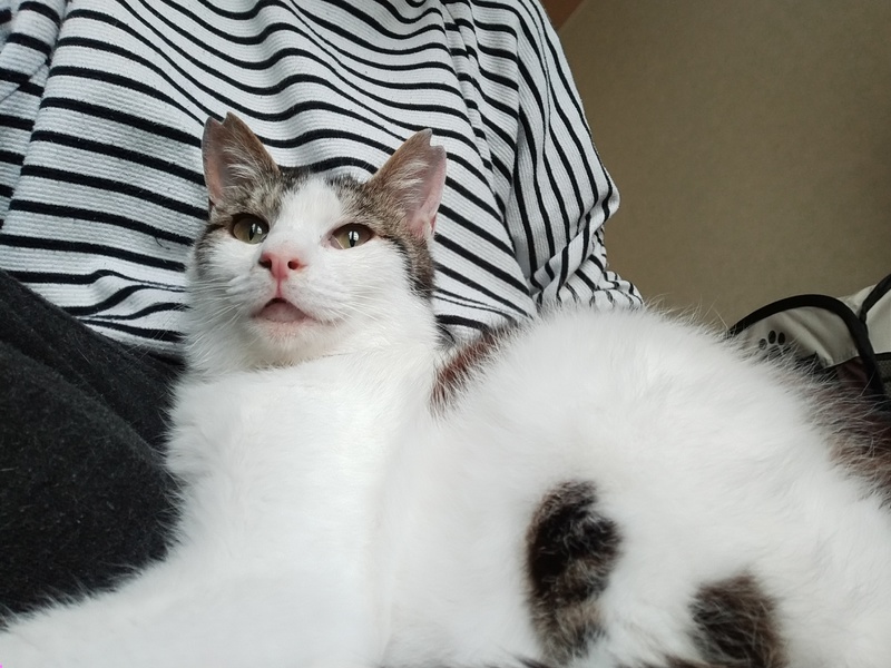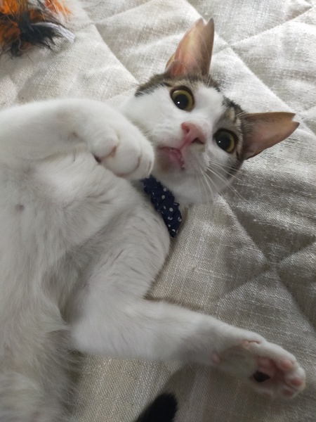 | 特徴(性格など) | キジ白 サバ白 シュッとしたイケメン まっすぐなしっぽ 人間大好き 猫大好き おっかけっこ大好き 保護当時下唇部分がハゲてしまっていましたが、少しずつ生え揃ってきています。 人の顔が特に好きみたいで抱っこするとすごい勢いでスリスリしてきます。 |