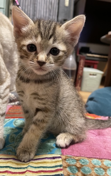 | 特徴(性格など) | 長く真っ直ぐな尻尾のキジトラです。 おとなしい女の子です。 |