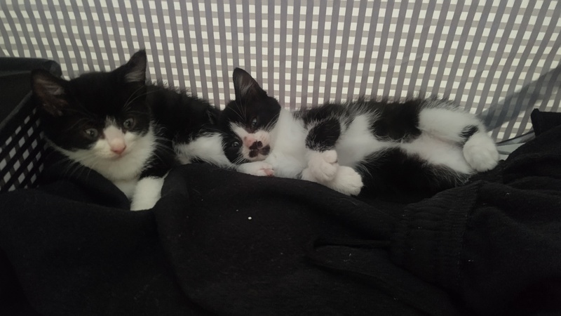 | 特徴(性格など) | 黒と白のはちまた子猫ちゃん。 足元だけ靴下履いてるみたいに白色です。 人懐っこく元気でやんちゃです 右側のちょび髭ちゃんです |
