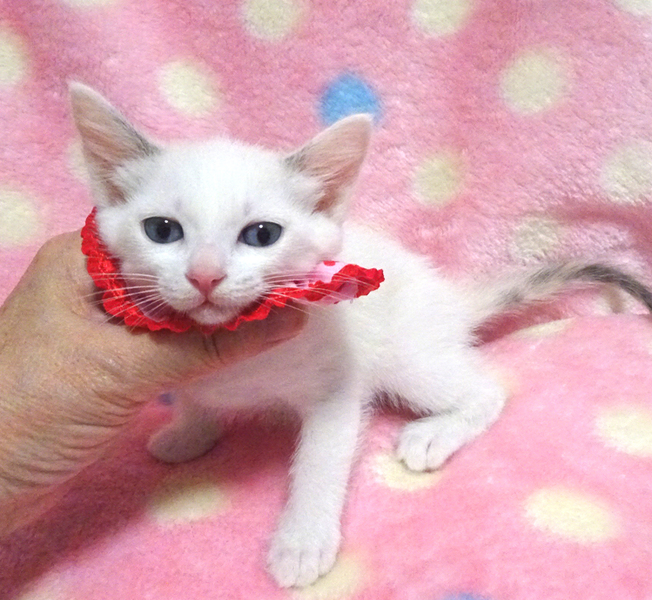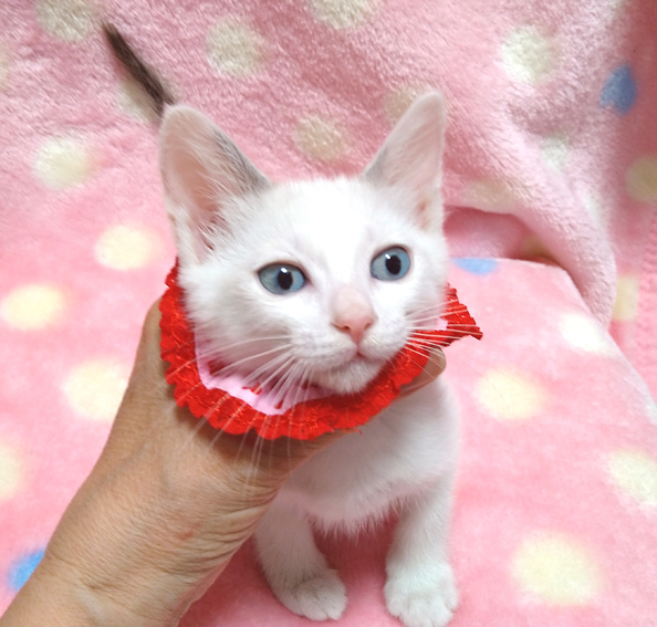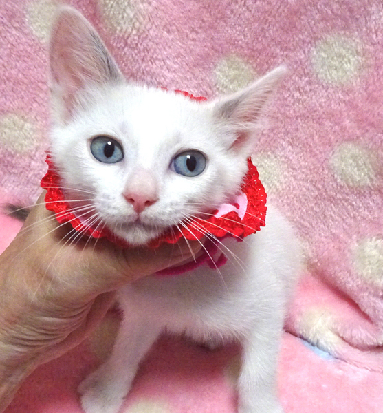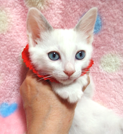 | 特徴(性格など) | 【猫の仮名】美月(みつき)ちゃん (担当 松嶋) 【毛色・柄】青い目、白、シッポはグレーで長くて真っすぐ 家猫の母親の元で育ったので栄養状態が良く、きれいな子です♪ 小さくてもトイレができる賢い子です♪ 猫を飼うのが初めての方でも大丈夫です♪ 走っても大丈夫なペット可のお住まいで、猫だけのお留守番が長時間でないご家族を募集しています。 元飼い主の希望により、お一人暮らし、同棲中の方、ご高齢の方には譲渡できません。 |
